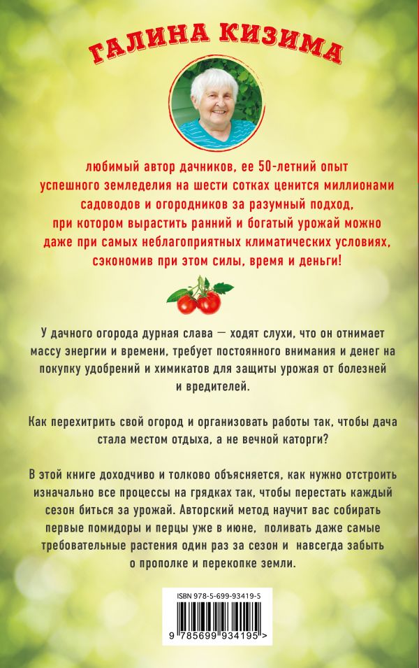Эта книга специально для тех, кто не верит в то, что огород на даче может стать местом отдыха, а не вечной каторги с весны до глубокой осени. 50-летний опыт Галины Кизимы, известного в России садовода-любителя, доказывает: спелые помидоры в Питере можно собирать уже в июне, поливать даже самые требовательные растения можно однажды за сезон, а о прополке и перекопке земли не стыдно забыть и вовсе. В этой книге доходчиво и толково объясняется, как правильно "воспитать" свой огород, системно отстроить все процессы один раз, чтобы перестать каждый сезон биться за урожай. И научиться получать удовольствие от выращивания любимых овощей!