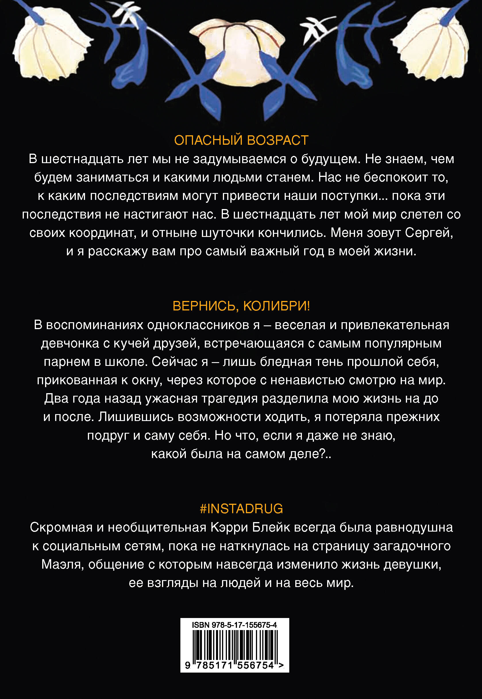 ОПАСНЫЙ ВОЗРАСТ В шестнадцать лет мы не задумываемся о будущем. Не знаем, чем будем заниматься и какими людьми станем. Нас не беспокоит то, к каким последствиям могут привести наши поступки... пока эти последствия не настигают нас. В шестнадцать лет мой мир слетел со своих координат, и отныне шуточки кончились. Меня зовут Сергей, и я расскажу вам про самый важный год в моей жизни. ВЕРНИСЬ, КОЛИБРИ! В воспоминаниях одноклассников я - веселая и привлекательная девчонка с кучей друзей, встречающаяся с самым популярным парнем в школе. Сейчас я - лишь бледная тень прошлой себя, прикованная к окну, через которое с ненавистью смотрю на мир. Два года назад ужасная трагедия разделила мою жизнь на до и после. Лишившись возможности ходить, я потеряла прежних подруг и саму себя. Но что, если я даже не знаю, какой была на самом деле?.. #INSTADRUG Скромная и необщительная Кэрри Блейк всегда была равнодушна к социальным сетям, пока не наткнулась на страницу загадочного Маэля, общение с которым навсегда изменило жизнь девушки, ее взгляды на людей и на весь мир| Издательство | ИЗДАТЕЛЬСТВО "АСТ" |