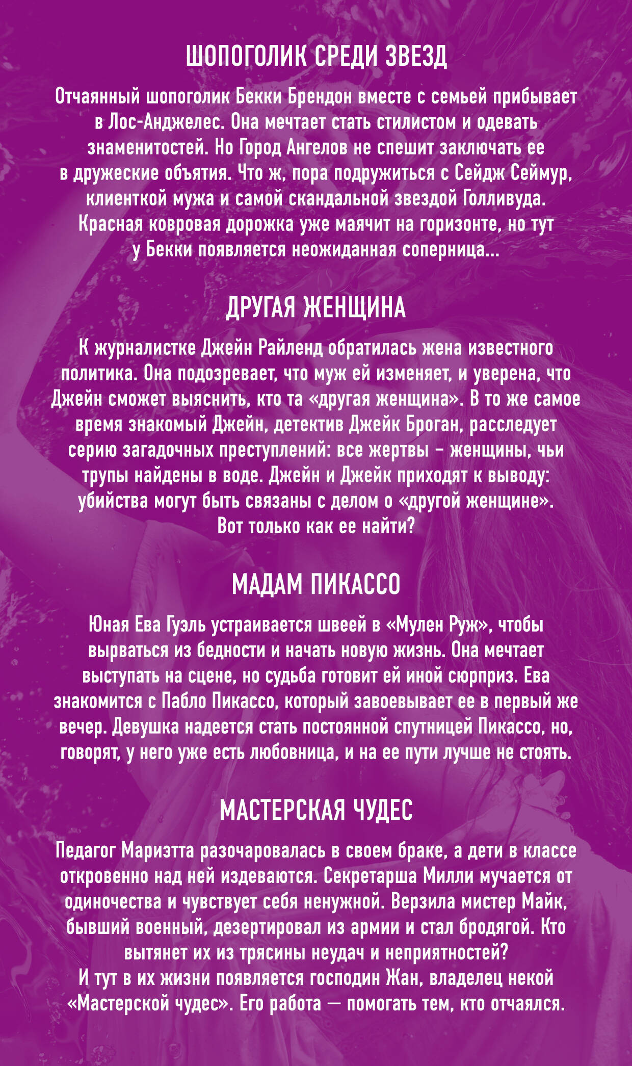 Комплект из 4-х книг: Шопоголик среди звезд Другая женщина Мадам Пикассо Мастерская чудес Шопоголик среди звезд Отчаянный шопоголик Бекки Брендон вместе с семьей прибывает в Лос-Анджелес. Она мечтает стать стилистом и одевать знаменитостей. Но город зеленых лужаек и загорелых красавцев не спешит заключать ее в дружеские объятия. Как же ей быть? Озарение приходит вместе с новой покупкой. Нужно подружиться с Сейдж Сеймур, клиенткой мужа и самой скандальной звездой Голливуда. Красная ковровая дорожка уже маячит на горизонте, когда появляется давняя и непримиримая соперница Сейдж. Эта коварная интриганка может помешать карьере Бекки. Но шопоголики не сдаются без боя. Посмотрим, кто кого? Другая женщина К Джейн Райленд, опальной журналистке, обратилась жена известного политика, баллотирующегося на пост сенатора. Она подозревает, что муж ей изменяет, и уверена, что Джейн сможет выяснить, кто та "другая женщина", которая стала ее соперницей. В то же самое время знакомый журналистки, детектив Джейк Броган, расследует серию загадочных преступлений: все жертвы - женщины, все трупы найдены в воде. Неужели в Бостоне орудует маньяк? Постепенно Джейн и Джейк приходят к невероятному выводу: убийства могут быть связаны с избирательной кампанией будущего сенатора. А ключ к их разгадке - та самая "другая женщина". Вот только как ее найти? Мадам Пикассо Юная Ева Гуэль устраивается швеей в "Мулен Руж", чтобы вырваться из бедности и начать новую жизнь. Втайне она мечтает выступать на сцене и даже берет для этого яркий псевдоним - Марсель Умбер. Но судьба готовит ей сюрприз. Ева знакомится с Пабло Пикассо, который завоевывает ее в первый же вечер. Девушка надеется стать постоянной спутницей Пикассо, но, говорят, у него уже есть любовница, и на ее пути лучше не стоять. Мастерская чудес Герои новой книги Валери Тонг Куонг переживают не лучшие времена. Учительница Мариэтта разочаровалась в своем муже, а дети в классе откровенно над ней издеваются. Секретарша Милли мучается от одиночества и чувствует себя ненужной. Верзила мистер Майк, бывший военный, дезертировал из армии и стал бродягой. Нужно, чтобы кто-то вытянул их из трясины неудач и неприятностей. И - чудо! - в их жизни появляется господин Жан, владелец необычной "Мастерской чудес". Его работа - помогать тем, кто отчаялся. Кто он? Волшебник? Чудак-альтруист? И да, и нет. В самом финале читатель узнает, что у господина Жана - своя история, которая многое объясняет...| Издательство | ООО "Издательство "Эксмо" |