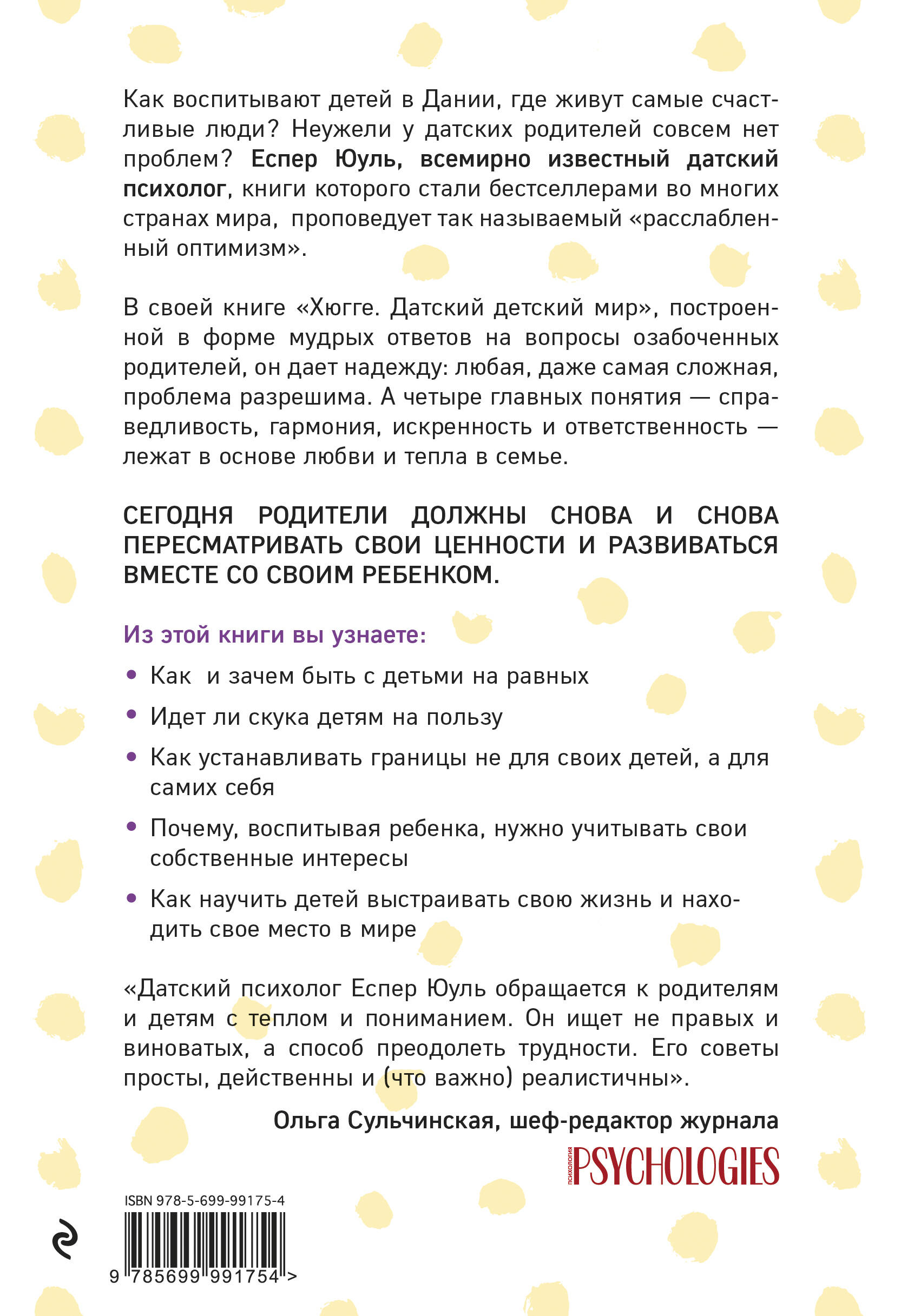 Каждая семья уникальна, в любой из них действуют свои собственные правила и складываются принципы взаимоотношений с детьми. Поэтому в своих книгах и статьях выдающийся датский психолог Еспер Юуль не предлагает готовых рецептов безоблачного счастья. Без серьезных усилий достичь родителей нужного результата не получится. В книге «Хюгге. Датский детский мир» он призывает родителей поразмыслить над своей жизнью, а не дает исчерпывающих рекомендаций. Из этой книги вы узнаете • Как и зачем быть с детьми на равных • Идет ли скука детям на пользу • Как устанавливать границы не для своих детей, а для самих себя • Почему, воспитывая ребенка, нужно учитывать свои собственные интересы • Как научить детей выстраивать свою жизнь и находить свое место в мире Об авторе Еспер Юуль - датский психотерапевт, работает в области психологии семейных взаимоотношений более 35 лет, является одним из наиболее известных специалистов в Европе. После 25 лет руководства Скандинавским институтом Кемплера, в 2004 году Юуль основал собственный консультационный центр для родителей, который называется Международная семейная лаборатория. В рамках этой организации он проводит семинары и тренинги для родителей и коллег в Германии, Австрии, Швейцарии и еще 13 странах. На сегодняшний день Еспер Юуль считается автором самых успешных книг по воспитанию, многие их которых стали бестселлерами и переведены практически на все европейские языки.| Издательство | ООО "Издательство "Эксмо" |