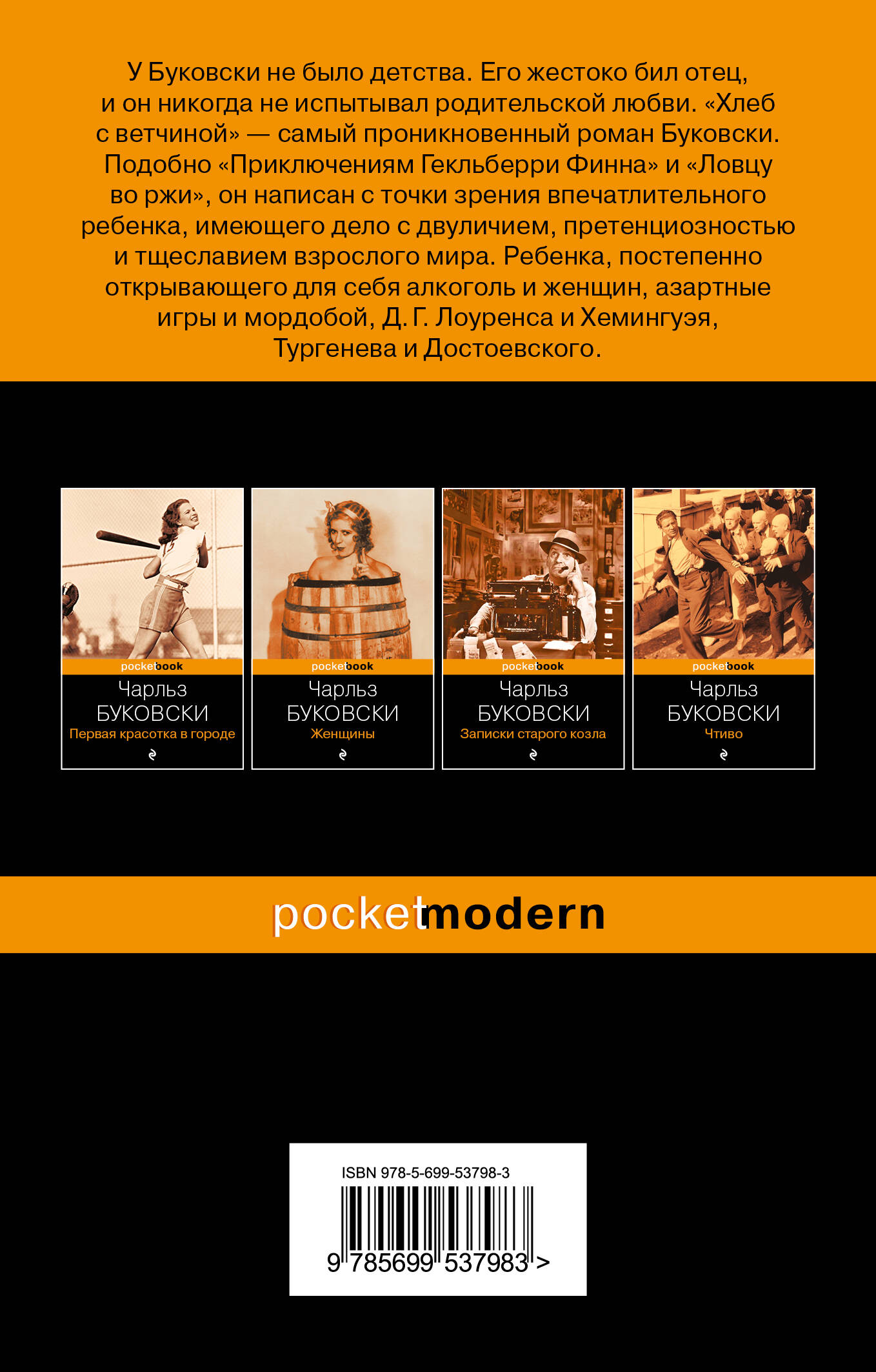 «Хлеб с ветчиной» - самый проникновенный роман Буковски. Подобно «Приключениям Гекльберри Финна» и «Ловцу во ржи», он написан с точки зрения впечатлительного ребенка, имеющего дело с двуличием, претенциозностью и тщеславием взрослого мира. Ребенка, постепенно открывающего для себя алкоголь и женщин, азартные игры и мордобой, Д.Г. Лоуренса и Хемингуэя, Тургенева и Достоевского.
