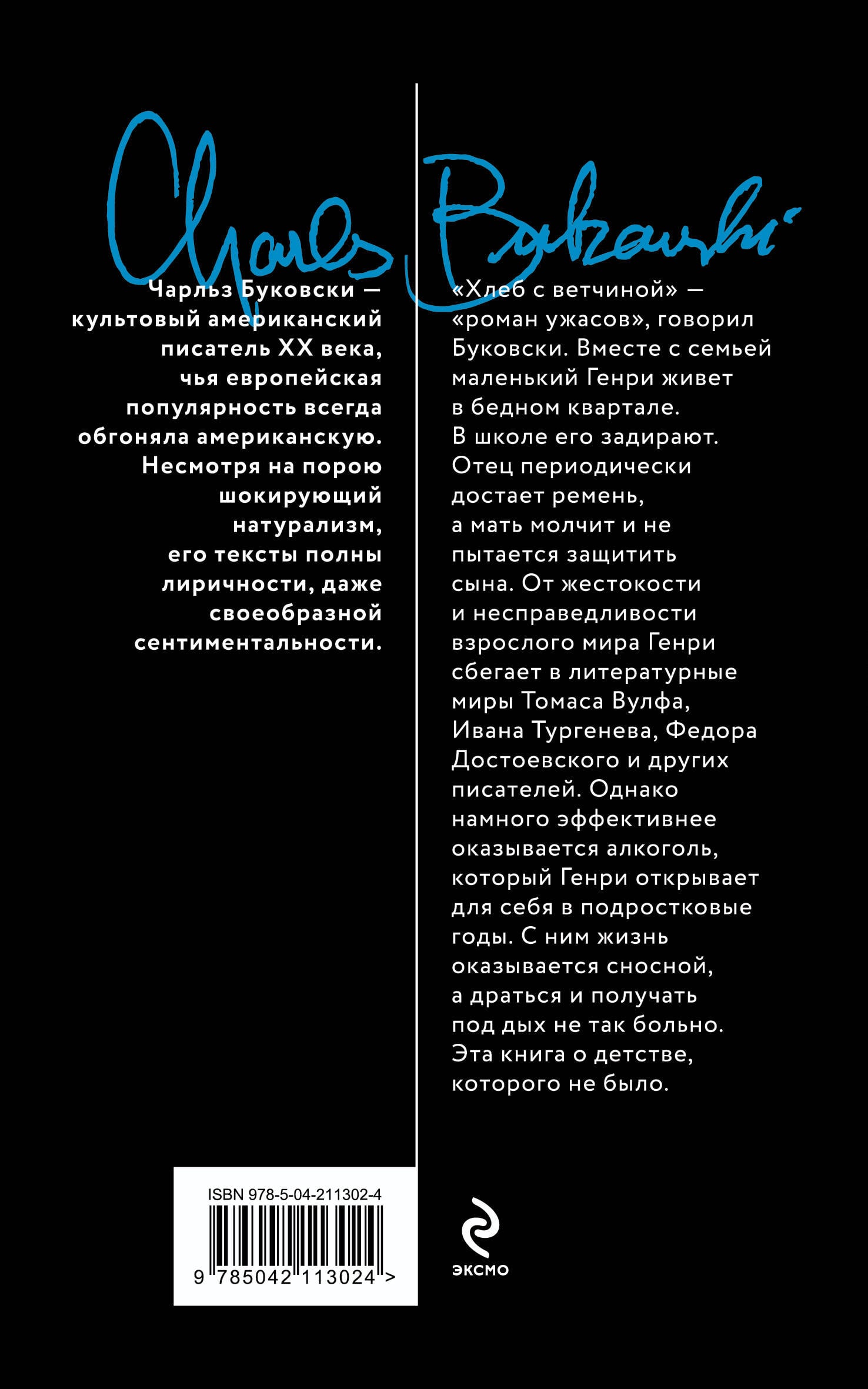 Чарльз Буковски - культовый американский писатель XX века, чья европейская популярность всегда обгоняла американскую. Несмотря на порою шокирующий натурализм, его тексты полны лиричности, даже своеобразной сентиментальности. "Хлеб с ветчиной" - "роман ужасов", говорил Буковски. Вместе с семьей маленький Генри живет в бедном квартале. В школе его задирают. Отец периодически достает ремень, а мать молчит и не пытается защитить сына. От жестокости и несправедливости взрослого мира Генри сбегает в литературные миры Томаса Вулфа, Ивана Тургенева, Федора Достоевского и других писателей. Однако намного эффективнее оказывается алкоголь, который Генри открывает для себя в подростковые годы. С ним жизнь оказывается сносной, а драться и получать поддых не так больно. Эта книга о детстве, которого не было.| Издательство | ООО "Издательство "Эксмо" |