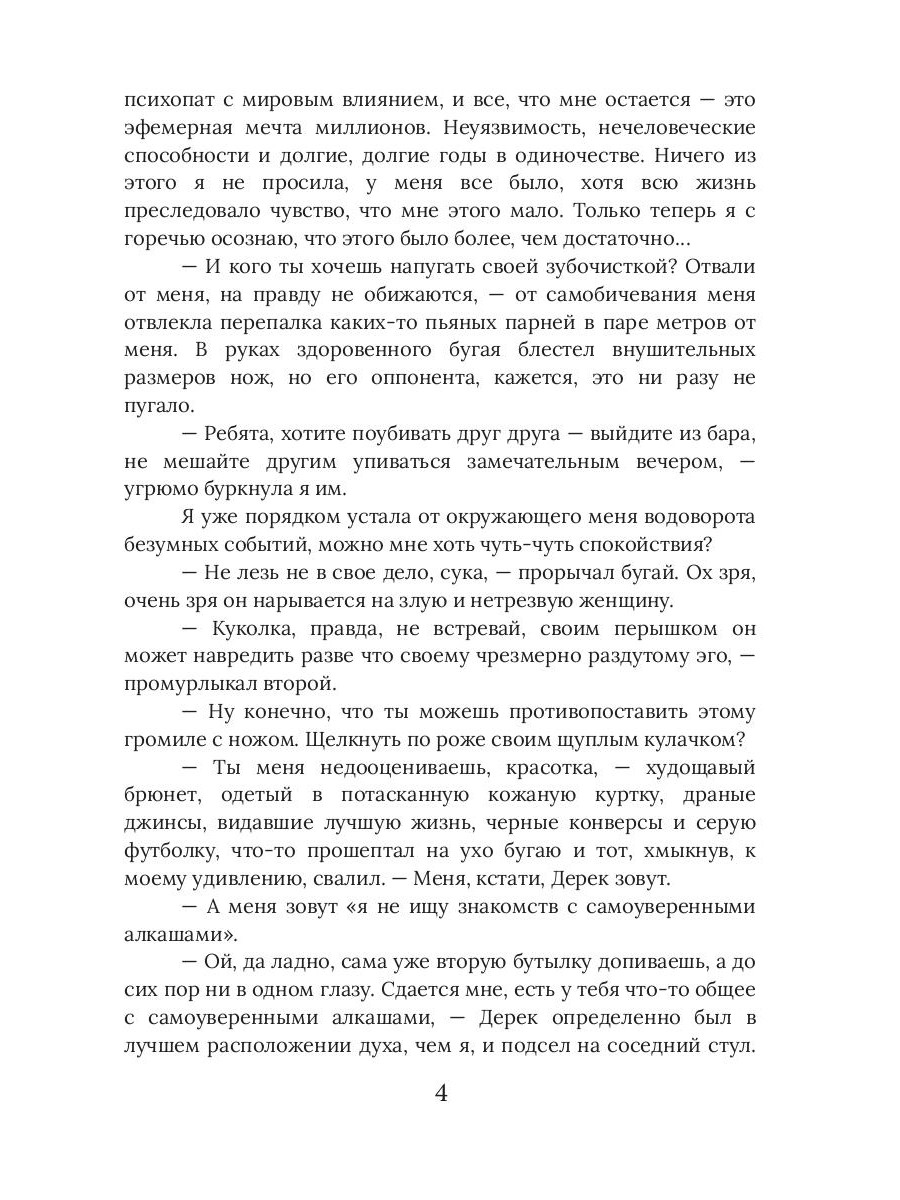 Вы когда-нибудь задумывались о том, что, проснувшись однажды утром, обнаружите, что вы - бессмертны? Что вдруг эфемерная мечта миллионов станет для вас реальностью? Что вы сделаете со своим даром? Попытаетесь ли измениться сами, изменить этот мир или продолжите наслаждаться жизнью? Станет ли для вас это даром или проклятием? У героини этой книги есть все и даже больше. Точнее, было... Любящий и верный муж, успешная карьера, шикарный дом, с десяток преданных друзей, здоровые и счастливые родители. А еще у нее была достаточно заурядная жизнь, как и у миллионов других простых смертных. Но лишь один неосторожный шаг, и все, чем она была, разрушилось как карточный домик. Сможет ли она адаптироваться в этой новой реальности, сумеет ли снова найти себя и свою роль в этом мире и стать частью чего-то большего? Научится ли быть бессмертной?| Издательство | Т8 RUGRAM |
