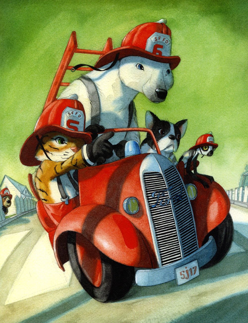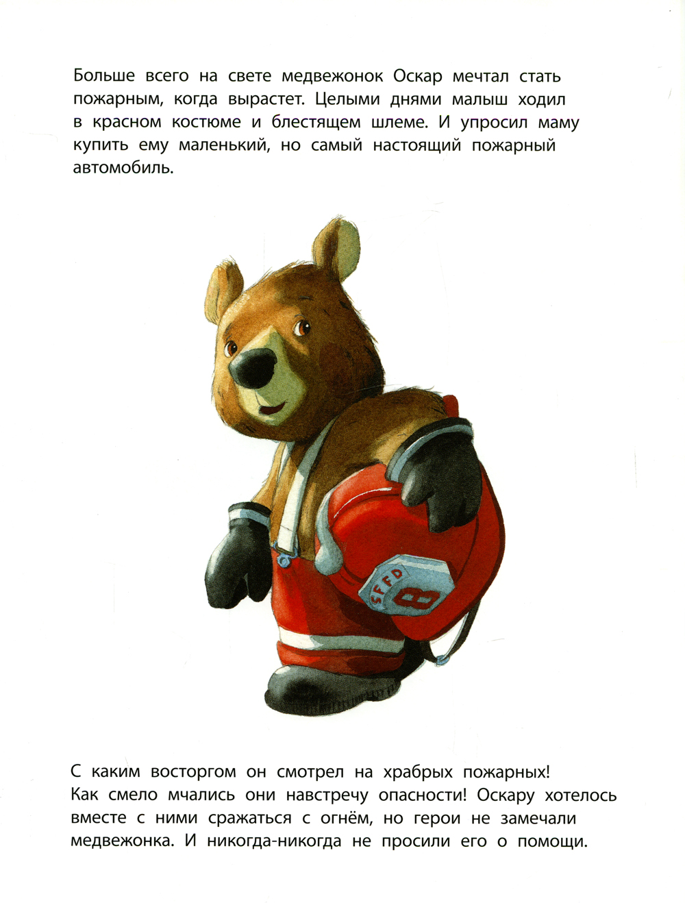 Маленький медвежонок мечтал стать пожарным. Он целыми днями ходил в красном костюме и блестящем шлеме и с восторгом смотрел на настоящих пожарных, когда они смело мчались навстречу опасности. Малышу хотелось вместе с ними сражаться с огнём, но никто не просил его о помощи. И вот он уговорил маму купить ему маленький, но самый настоящий пожарный автомобиль. Поначалу незадачливый герой натворил немало бед, но в конце концов ему удалось совершить настоящий подвиг… Эту смешную историю придумал и нарисовал известный бельгийский художник Квентин Гребан, замечательные рисунки которого хорошо знают и любят малыши во многих странах мира. Для чтения взрослыми детям.