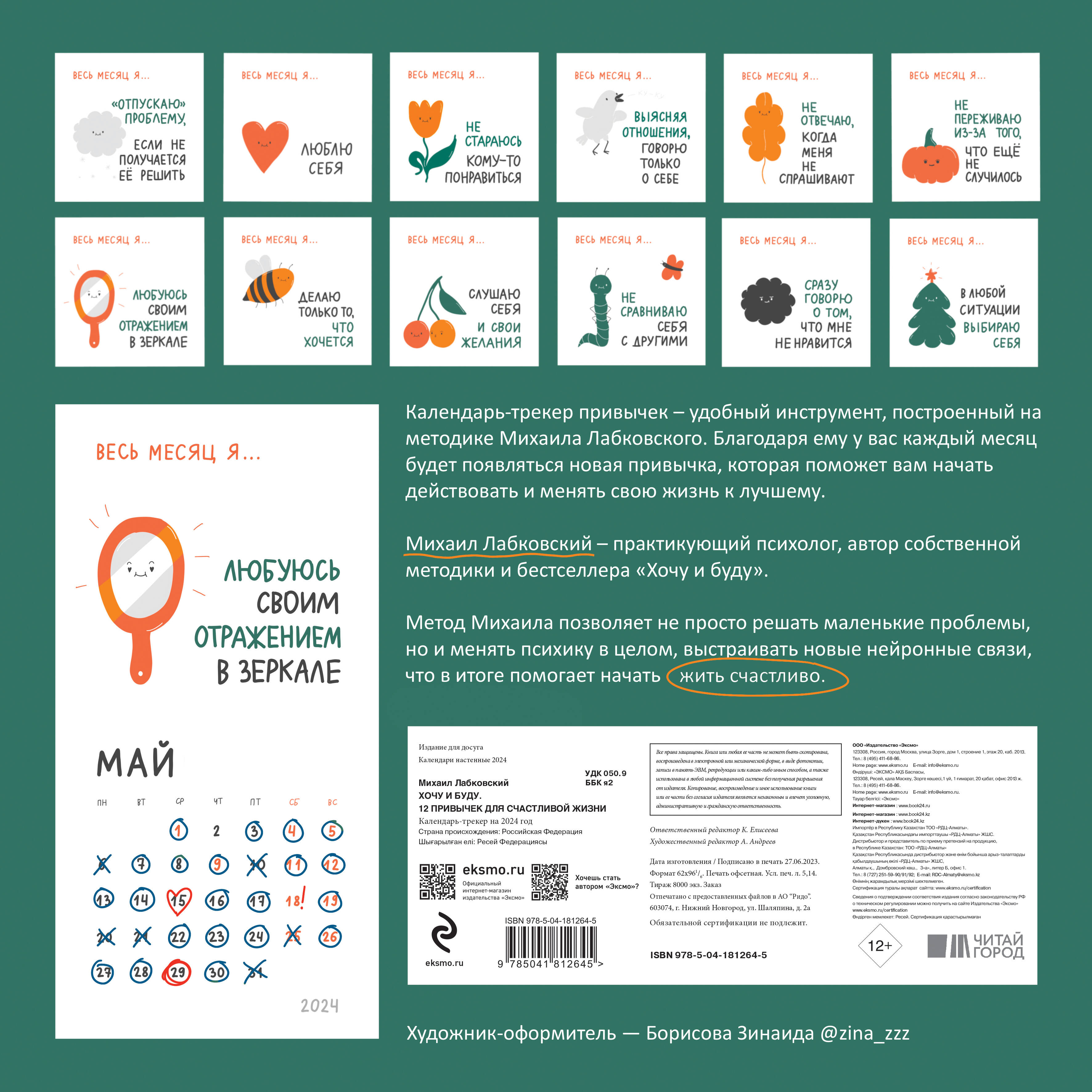 Аннотация: Хочу и буду. 12 привычек для счастливой жизни. Календарь-трекер на 2024 год (300х300 мм)
