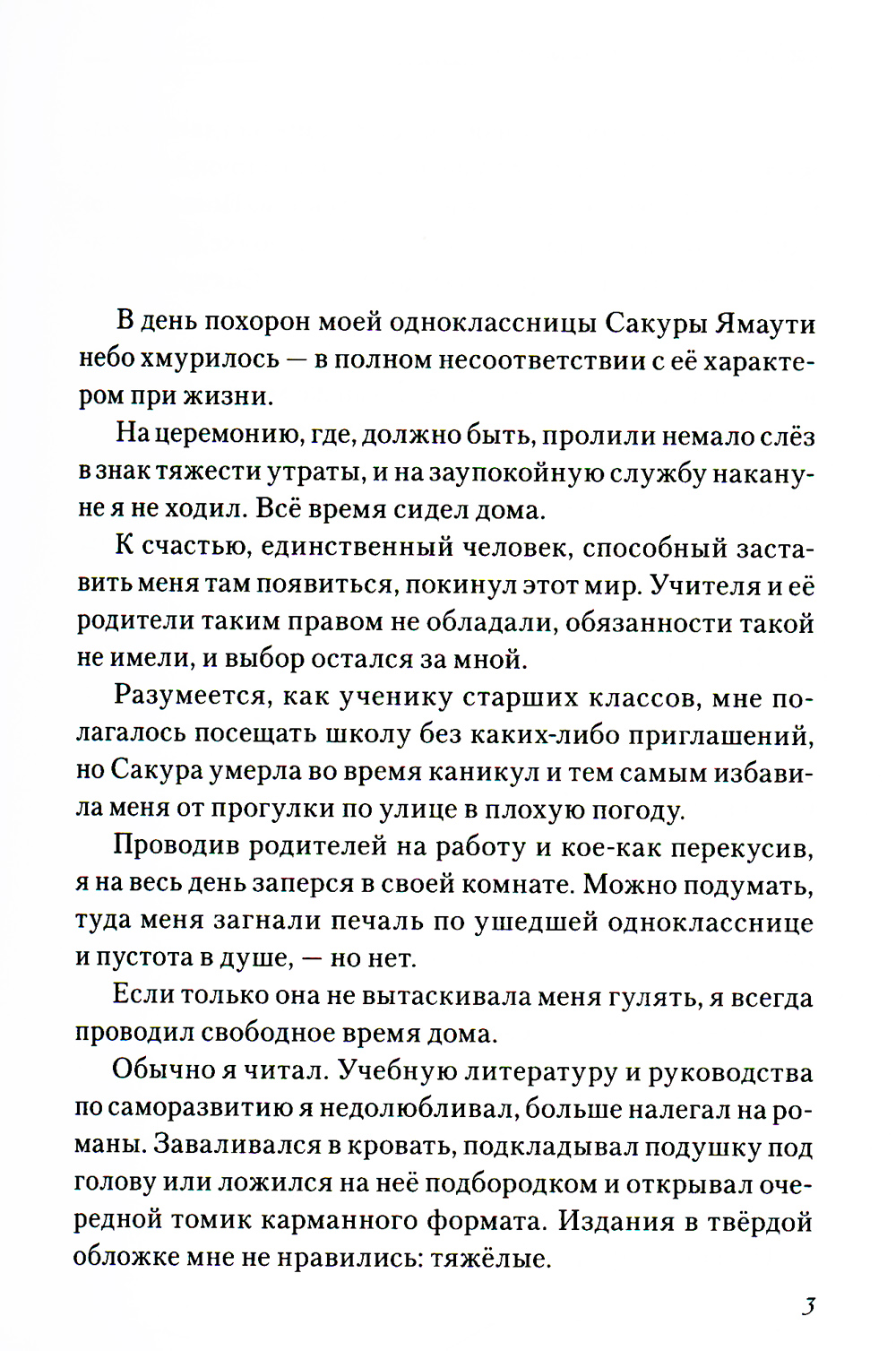 - Просто уточню: именно мою? - Чью же ещё? Однажды, когда я учился в старшей школе, я подобрал в больнице одну книгу. Она называлась «Книга жизни с болезнью». Это был дневник, который тайно вела моя одноклассница Сакура Ямаути. И в нём она написала, что из-за заболевания поджелудочной железы жить ей осталось недолго... Вы не сможете оторваться от этой книги вплоть до опровергающей все прогнозы развязки! Дебютная работа автора, удостоенная «Премии ассоциации продавцов книг» 2016 года (2-е место) и разошедшаяся в Японии тиражом свыше 2 миллионов 950 тысяч экземпляров.| Издательство | ИД Истари Комикс |