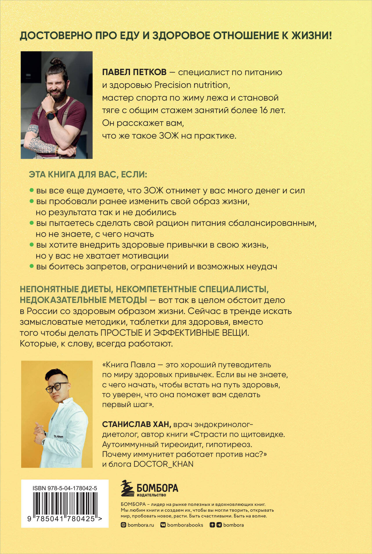ДОСТОВЕРНО ПРО ЕДУ И ЗДОРОВОЕ ОТНОШЕНИЕ К ЖИЗНИ. НЕПОНЯТНЫЕ ДИЕТЫ, НЕКОМПЕТЕНТНЫЕ СПЕЦИАЛИСТЫ, НЕДОКАЗАТЕЛЬНЫЕ МЕТОДЫ - вот так, в целом, обстоит дело со здоровым образом жизни. Сейчас в тренде искать новые замысловатые методики, таблетки для здоровья, вместо того чтобы делать ПРОСТЫЕ И ЭФФЕКТИВНЫЕ ВЕЩИ. Которые, к слову, всегда работают. Автор этой книги, Павел Петков, нутрициолог, тренер, специалист по тренировочной адаптации, мастер спорта по жиму лежа и становой тяге, расскажет вам, что из себя представляет ЗОЖ на практике. Под научной редакцией Станислава Хана, врача эндокринолога-диетолога, автора книги «Страсти по щитовидке. Аутоиммунный тиреоидит, гипотиреоз. Почему иммунитет работает против нас?» и блога doctor_khan.| Издательство | ООО "Издательство "Эксмо" |