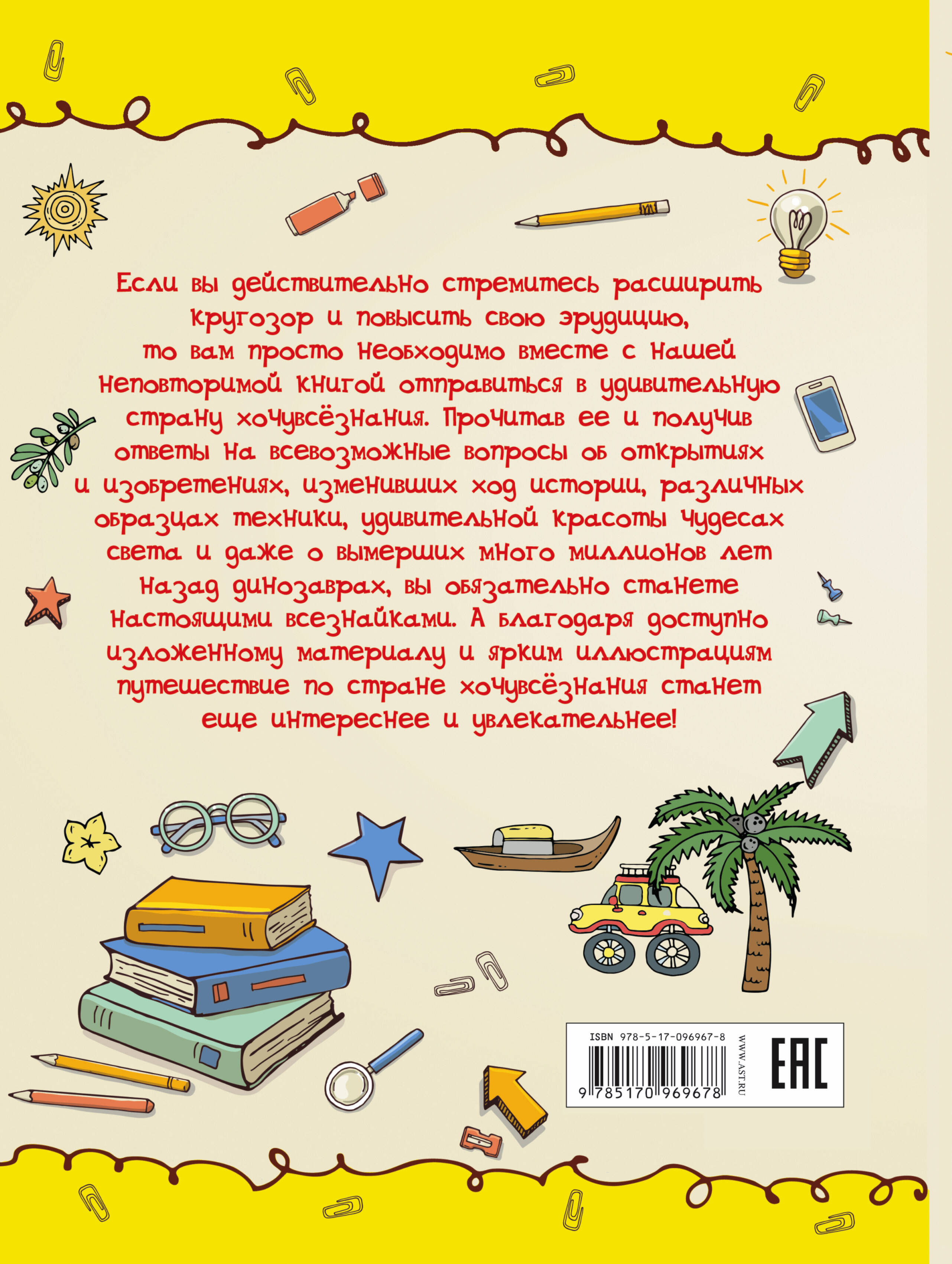 Кто действительно стремится повысить свою эрудицию и расширить кругозор, тому просто необходимо вместе с нашей книгой отправиться в удивительную страну хочувсёзнания! Ведь всезнайками не рождаются - ими становятся. Занимательная академия для детей гостеприимно распахнула свои страницы, чтобы ответить на всевозможные вопросы мальчишек и девчонок и рассказать об открытиях и изобретениях, изменивших ход истории, различных образцах техники, удивительной красоты чудесах света и даже о вымерших много миллионов лет назад динозаврах. Какую роль сыграло колесо в истории человечества? Что заставляет воздушный шар подниматься в небо? Почему во время первого показа фильма люди стали разбегаться из зала? Что современному автомобилю досталось в наследство от кареты? Где расположено "сердце" самолета, а где - его "мозг"? Какое единственное древнее чудо света сохранилось до наших дней? Зачем Герострат сжег храм Артемиды? Какие достопримечательности удостоены звания современных чудес света? Какими средствами защиты наградила природа мирных травоядных динозавров? У какого гигантского ящера мозг был размером с грецкий орех? Прочитав эту книгу, ребята непременно станут настоящими всезнайками. А помогут им в этом доступно изложенный, легкий для восприятия текст и яркие информативные иллюстрации - с ними путешествие по стране хочувсёзнания станет еще интереснее и увлекательнее! Для среднего школьного возраста.| Издательство | Издательство "АСТ" |