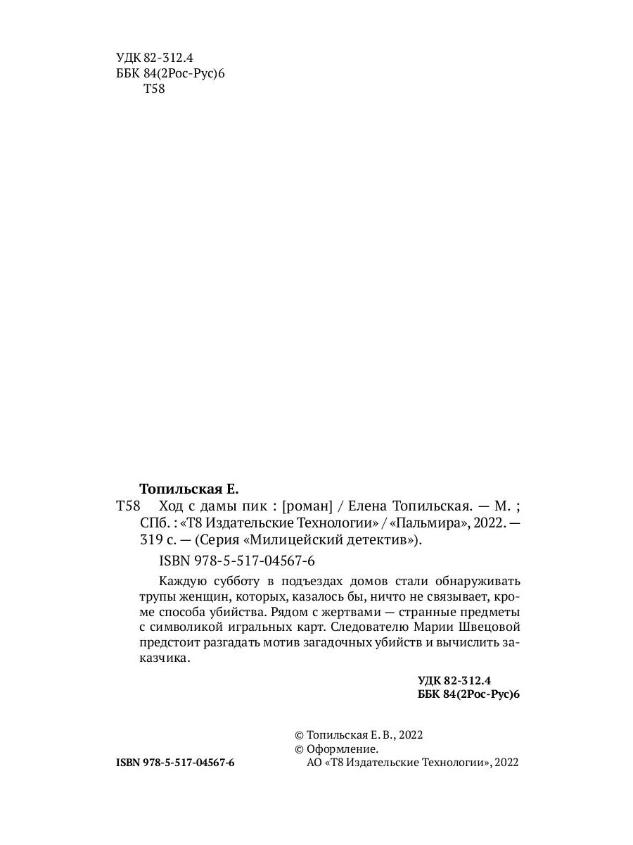 Каждую субботу в подъездах домов стали обнаруживать трупы женщин, которых, казалось бы, ничто не связывает, кроме способа убийства. Рядом с жертвами - странные предметы с символикой игральных карт. Следователю Марии Швецовой предстоит разгадать мотив загадочных убийств и вычислить заказчика.| Издательство | Т8 RUGRAM |