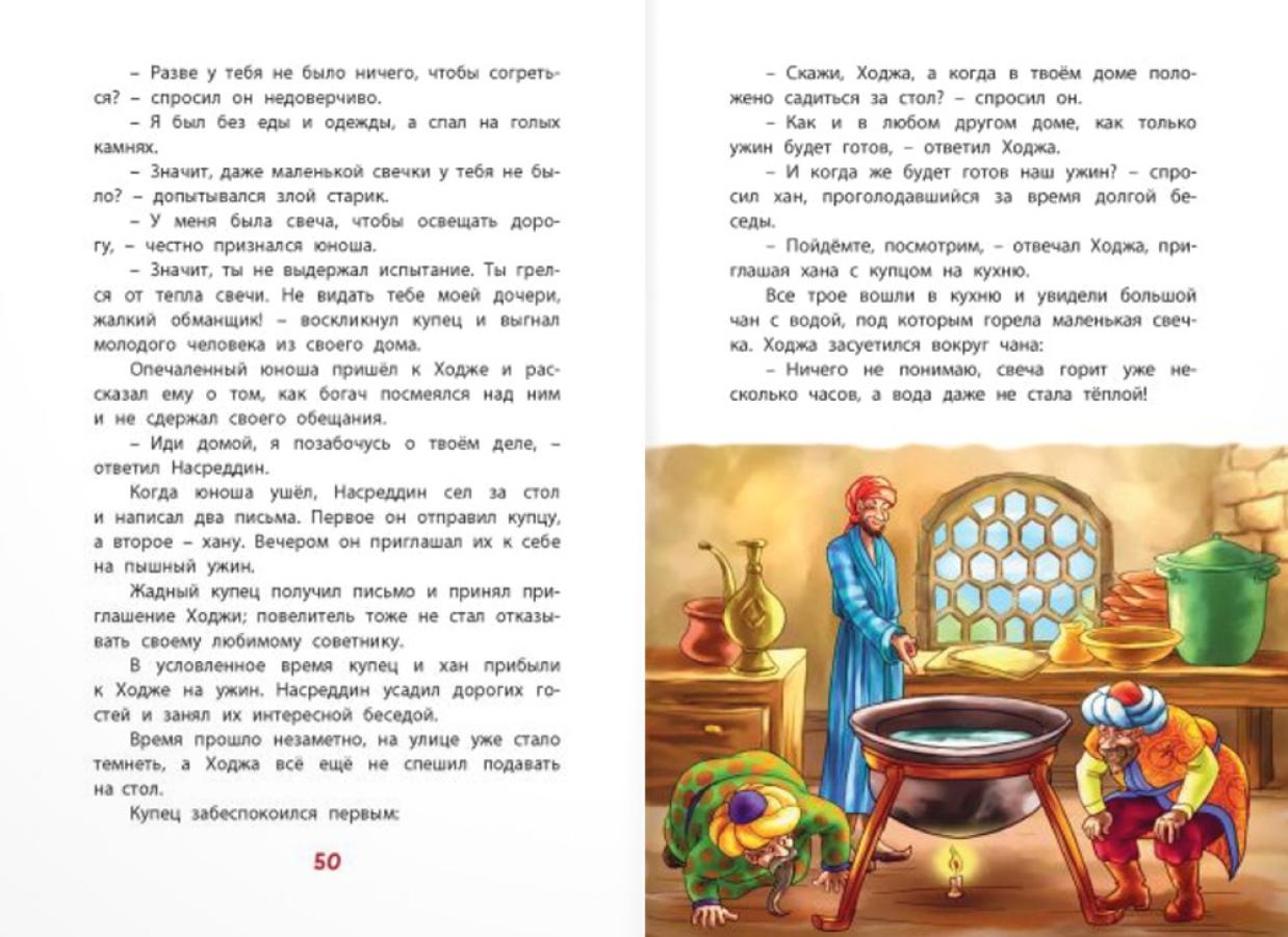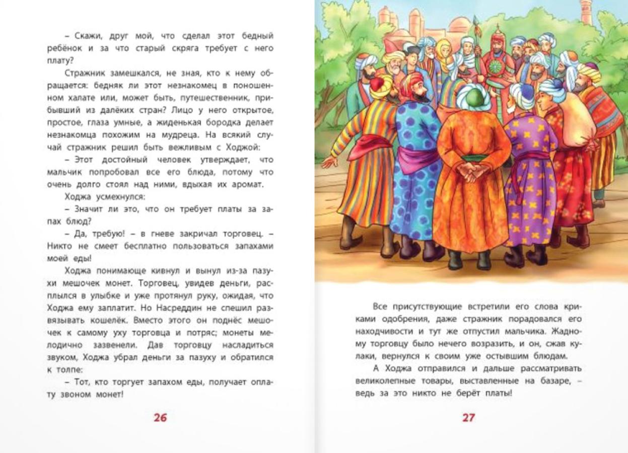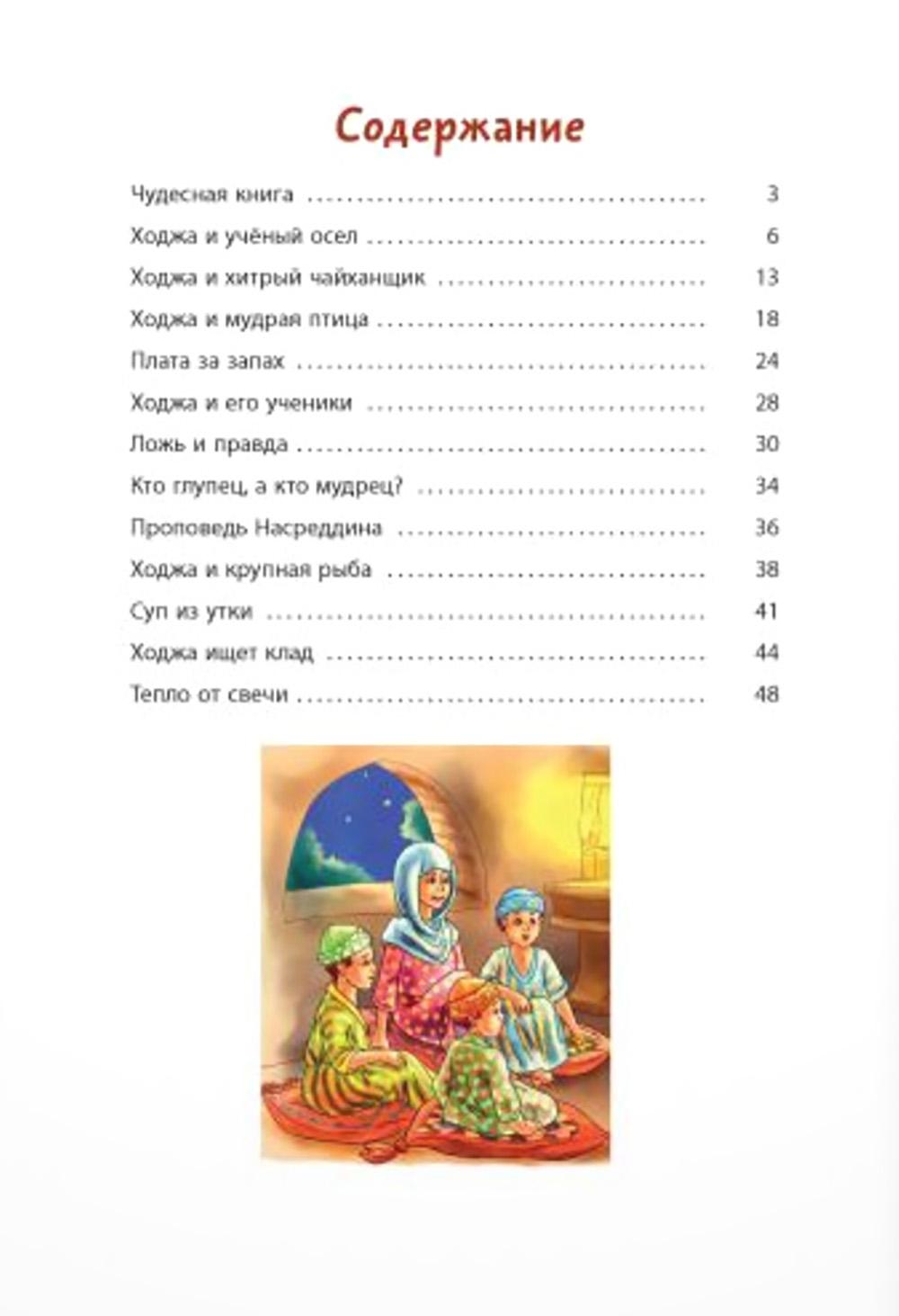 В книге собраны самые весёлые, самые известные притчи о Ходже Насреддине, которые с давних пор передают в Средней Азии из уст в уста. Этот остроумный, невероятно находчивый человек из народа выводит на чистую воду жадных и глупых, злых и несправедливых, его опасается сам великий правитель Бухары. Простодушный бродяга Ходжа Насреддин на самом деле - защитник обездоленных и угнетённых. Он всегда выходит сухим из воды и возвращает людям веру в справедливость. Для младшего школьного возраста. В содержание книги входят: - Чудесная книга - Ходжа и учёный осел - Ходжа и хитрый чайханщик - Ходжа и мудрая птица - Плата за запах - Ходжа и его ученики - Ложь и правда - Кто глупец, а кто мудрец? - Проповедь Насреддина - Ходжа и крупная рыба - Суп из утки - Ходжа ищет клад - Тепло от свечи| Издательство | ЭНАС-КНИГА |