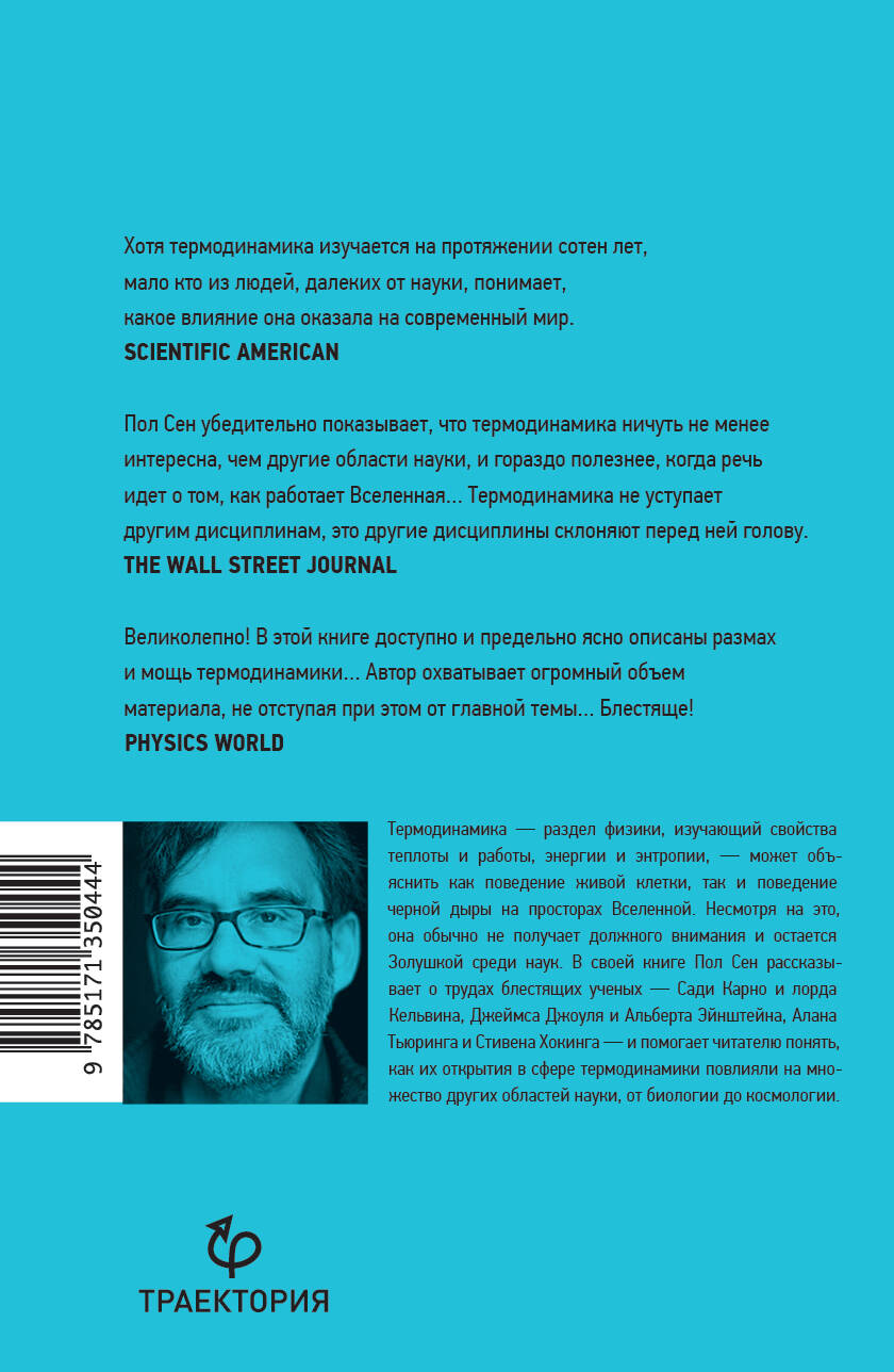 Термодинамикой можно объяснить практически любой известный нам феномен, она применима во всех научных сферах: от минералогии до биологии. С ее помощью можно рассказать, почему мы должны есть и дышать, каковы пределы вычислительной техники и каким будет конец Вселенной. Но все по порядку! Мы вместе с Сади Карно, Джеймсом Джоулем, Уильямом Томсоном начинаем с азов, чтобы потом продолжить идти вместе с их последователями и задавать все более сложные вопросы об устройстве нашего мира. Мы знакомимся с учеными, их характером, причудами, стремлениями и амбициями, чтобы затем шаг за шагом изобретать вместе с ними машины, измерять вязкость газов, спорить, искать и постепенно открывать новые законы физического мира. Так, захотев повысить эффективность паровой машины, Сади Карно даже не предполагал, что приоткроет для последующих поколений тайну Вселенной; но читателю подарена возможность узнать, к чему приведут эти идеи. В целом, это книга о людях, об их встречах, дискуссиях, содружествах, поисках. Пол Сен пишет легко и непринужденно, как рассказывал бы увлекательную историю в кругу друзей. Эта книга наполнена оптимизмом и надеждой на прогресс, она показывает, как наша жизнь действительно стала лучше благодаря всем блестящим исследователям, когда-либо работавшим в сфере термодинамики. "Изучение энергии, энтропии, температуры и законов, которым они подчиняются, сыграло огромную роль в величайшем в истории нашего вида улучшении условий жизни людей."| Издательство | ИЗДАТЕЛЬСТВО "АСТ" |
