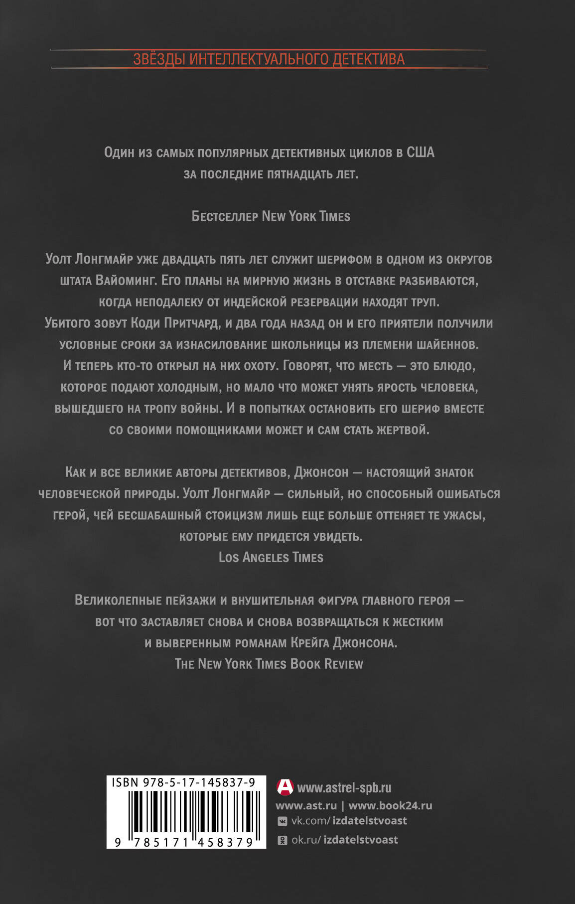 Уолт Лонгмайр уже двадцать пять лет служит шерифом в одном из округов штата Вайоминг. Его мечты на мирную жизнь в отставке разбиваются, когда неподалеку от индейской резервации находят труп. Убитого зовут Коди Притчард, и два года назад он и его приятели получили условные сроки за изнасилование школьницы из племени шайеннов. И теперь кто-то открыл на них охоту. Говорят, что месть - это блюдо, которое подают холодным, но мало что может унять ярость человека, вышедшего на тропу войны. И в попытках остановить его шериф вместе со своими помощниками может и сам стать жертвой.| Издательство | ИЗДАТЕЛЬСТВО "АСТ" |