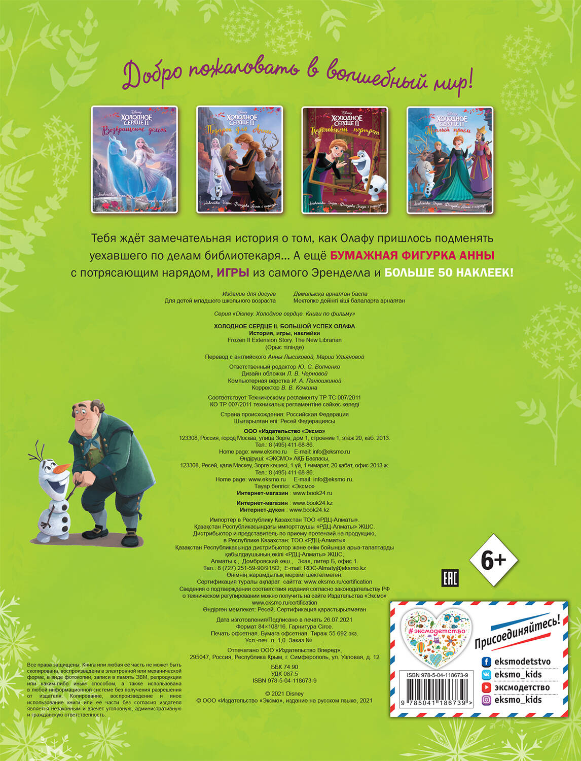 Тебя ждёт замечательная история о том, как Олафу пришлось подменять уехавшего по делам библиотекаря… А ещё бумажная фигурка Анны с прелестным нарядом, игры из самого Эренделла и больше 50 наклеек!