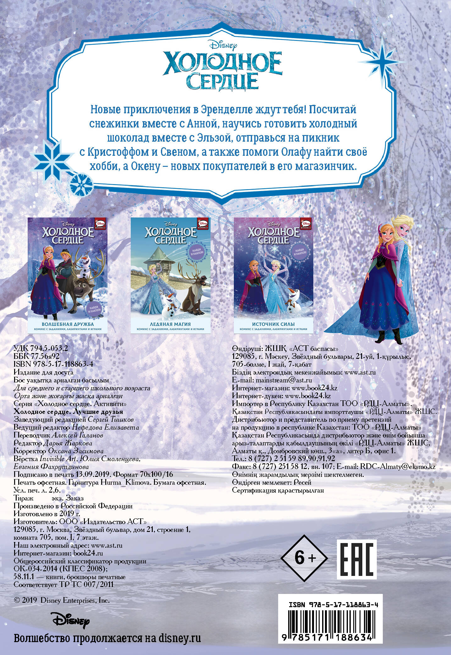 Новые приключения в Эренделле ждут тебя! Посчитай снежинки вместе с Анной, научись готовить холодный шоколад вместе с Эльзой, отправься на пикник с Кристоффом и Свеном, а также помоги Олафу найти своё хобби, а Окену - новых покупателей в его магазинчик.| Издательство | ИЗДАТЕЛЬСТВО "АСТ" |