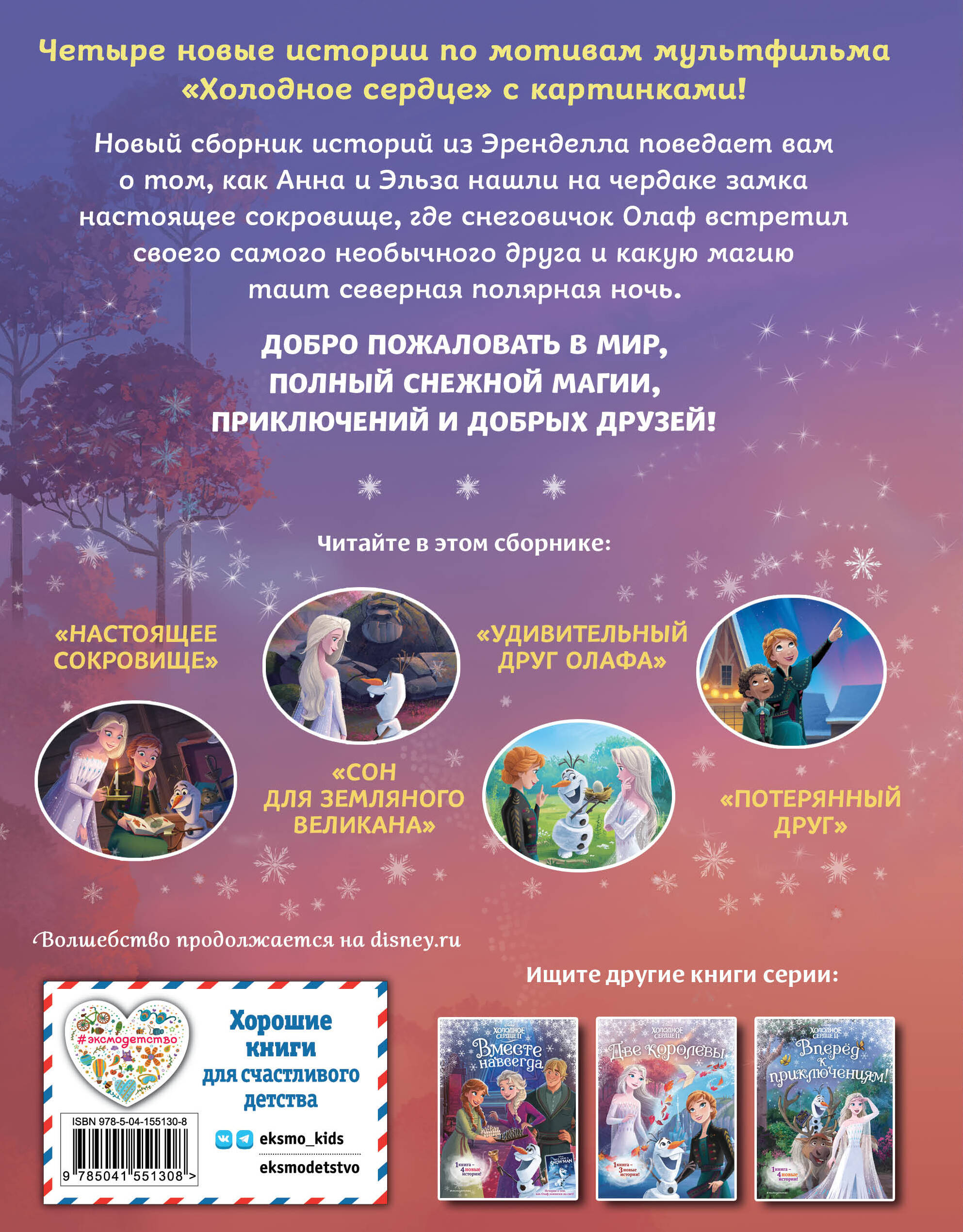 ДОБРО ПОЖАЛОВАТЬ НАЗАД В ЭРЕНДЕЛЛ! Встречайте новый сборник историй по самому популярному мультфильму Disney - «Холодное сердце». Новые приключении, новые друзья и новые сюжеты! Анна и Эльза находят карту сокровищ, нарисованную… их отцом! Олаф заводит нового друга - и нашёл он его в лесу! В Эренделле гости, которые никогда не видели полярной ночи… и её магии! А у Снежной королевы Эльзы теперь много новых хлопот, например - как уложить спать земляного великана? Все истории сопровождают потрясающе красивые цветные иллюстрации. Небольшие объёмы текста и герои любимого мультфильма делают эти книги идеальными для первого чтения. А для любого фаната «Холодного сердца» новые истории из любимого мира - лучший подарок! До встречи в самом волшебном королевстве Disney!| Издательство | ООО "Издательство "Эксмо" |