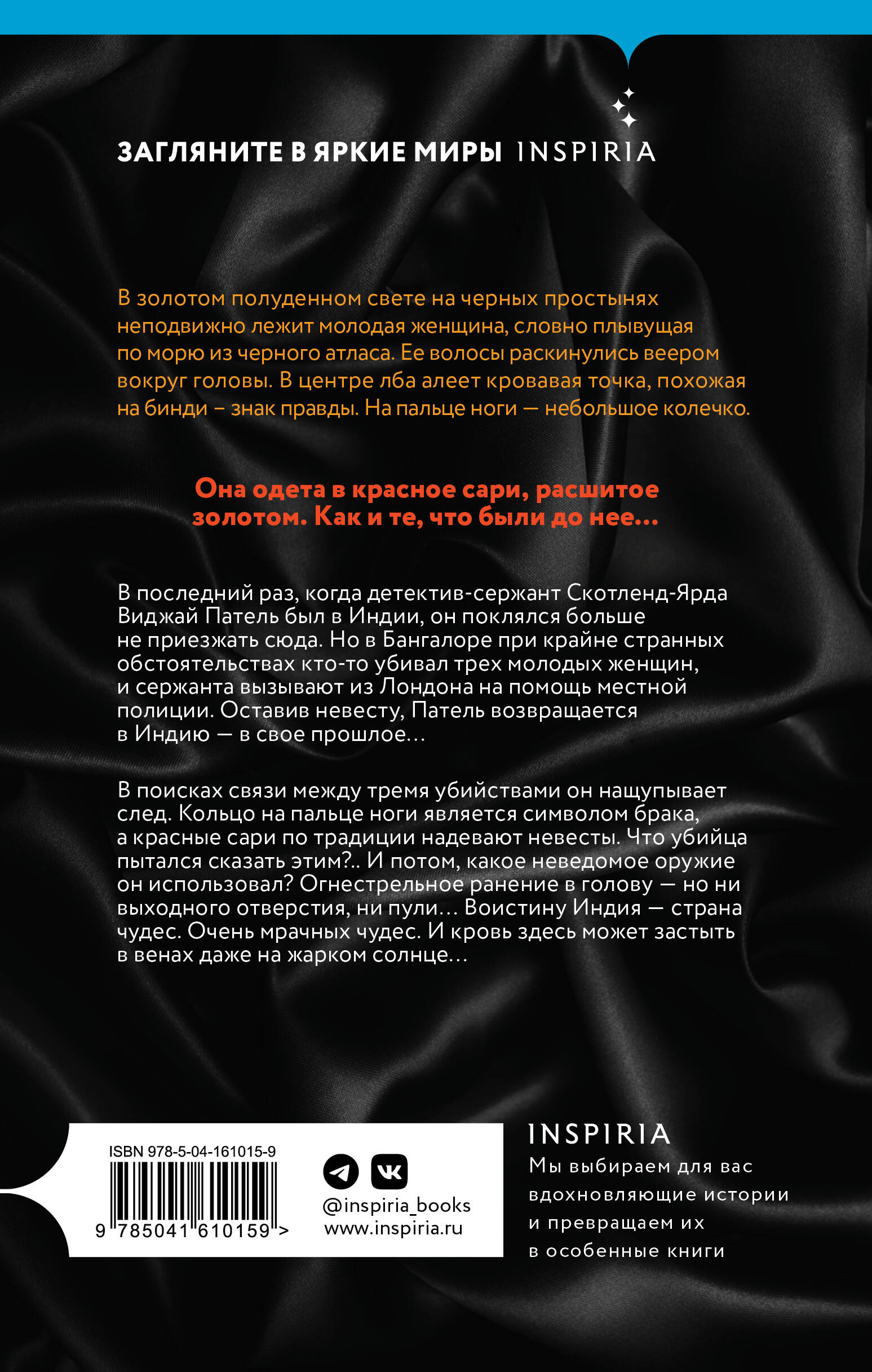 МРАЧНЫЙ И ТАИНСТВЕННЫЙ БОЛЛИВУД. НАЦИОНАЛЬНЫЙ БЕСТСЕЛЛЕР ИНДИИ. В золотом полуденном свете на черных простынях неподвижно лежит молодая женщина, словно плывущая по морю из черного атласа. Ее волосы раскинулись веером вокруг головы. В центре лба алеет кровавая точка, похожая на бинди - знак правды. На пальце ноги - небольшое колечко. Она одета в красное сари, расшитое золотом. Как и те, что были до нее… В последний раз, когда детектив-сержант Скотланд-Ярда Виджай Патель был в Индии, он поклялся больше не приезжать сюда. Но в Бангалоре при крайне странных обстоятельствах кто-то убивает трех молодых женщин, и его вызывают из Лондона на помощь местной полиции. Оставив невесту, Патель возвращается в Индию - в свое прошлое… В поисках связи между тремя убийствами он нащупывает след. Кольцо на пальце ноги является символом брака, а красные сари по традиции надевают невесты. Что убийца пытался сказать этим?.. И потом, какое неведомое оружие он использовал? Огнестрельное ранение в голову - но ни выходного отверстия, ни пули… Воистину, Индия - страна чудес. Очень мрачных чудес. И кровь здесь может застыть в венах даже на жарком солнце… --------------------------------------------------------------------------------------------------------- «Анита Шивакумаран - новое яркое имя в остросюжетной литературе». - The Times «Суперзахватывающий триллер… Вы будете гадать о том, кто убийца, до самого конца… Вас зацепит по полной программе». - Cosmopolitan «Очень хорошо прорисованные персонажи… Рекомендуется!» - NetGalley Reviewer «Быстро и захватывающе». - Beyond the Books| Издательство | Эксмо |