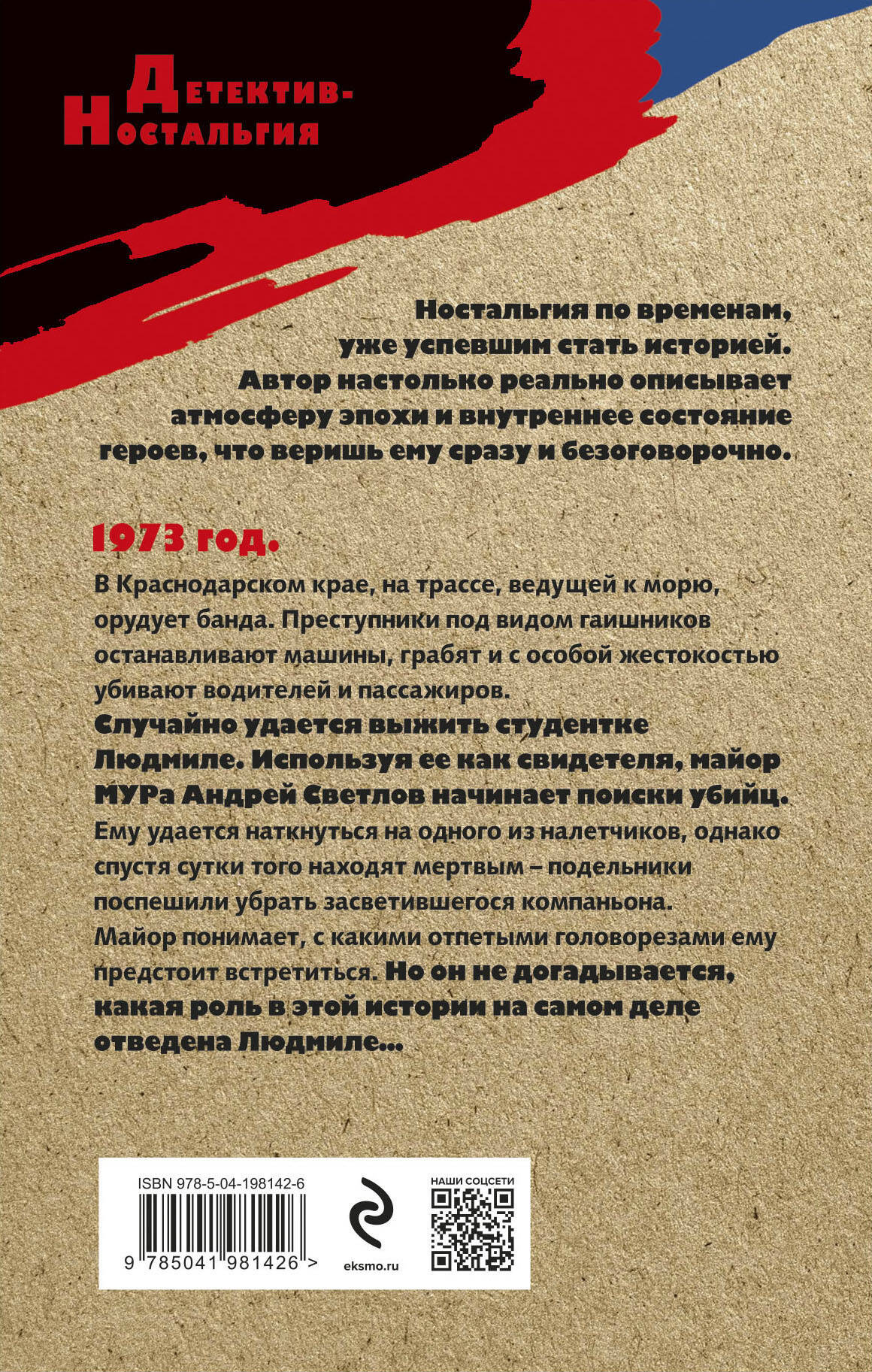 Ностальгия по временам, уже успевшим стать историей. Автор настолько реально описывает атмосферу эпохи и внутреннее состояние героев, что веришь ему сразу и безоговорочно. 1973 год. В Краснодарском крае, на трассе, ведущей к морю, орудует банда. Преступники под видом гаишников останавливают машины, грабят и с особой жестокостью убивают водителей и пассажиров. Случайно удается выжить студентке Людмиле. Используя ее как свидетеля, майор МУРа Андрей Светлов начинает поиски убийц. Ему удается наткнуться на одного из налетчиков, однако спустя сутки того находят мертвым - подельники поспешили убрать засветившегося компаньона. Майор понимает, с какими отпетыми головорезами ему предстоит встретиться. Но он не догадывается, какая роль в этой истории на самом деле отведена Людмиле… Уникальная возможность на время вернуться в недавнее прошлое и в ощущении полной реальности прожить вместе с героями самый отчаянный отрезок их жизни.| Издательство | ООО "Издательство "Эксмо" |