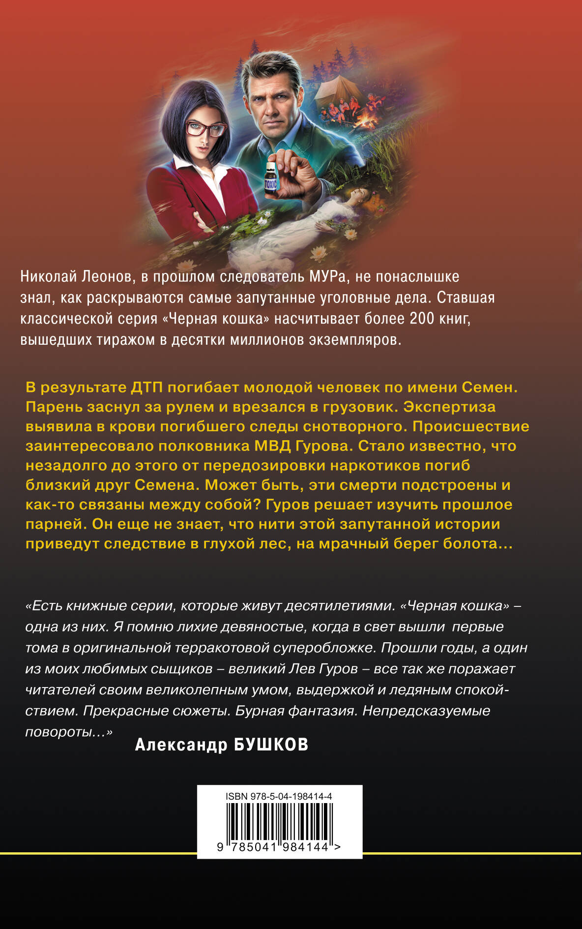 Легендарный детективный тандем Леонов - Макеев. В результате ДТП погибает молодой человек по имени Семен. Парень заснул за рулем и врезался в грузовик. Экспертиза выявила в крови погибшего следы снотворного. Происшествие заинтересовало полковника МВД Гурова. Стало известно, что незадолго до этого от передозировки наркотиков погиб близкий друг Семена. Может быть, эти смерти подстроены и как-то связаны между собой? Гуров решает изучить прошлое парней. Он еще не знает, что нити этой запутанной истории приведут следствие в глухой лес, на мрачный берег болота… Николай Леонов, в прошлом следователь МУРа, не понаслышке знал, как раскрываются самые запутанные уголовные дела. Поэтому каждая его книга - это правдивая захватывающая история с непредсказуемой интригой и неожиданным финалом. Главный герой этих книг, полковник Лев Гуров - сыщик высокого класса, к тому же с массой положительных человеческих качеств. Его уважают друзья, боятся враги и любят женщины. Он - настоящий отечественный супермен. Романы о Льве Гурове вот уже сорок лет неизменно привлекают поклонников отечественного детектива. Ставшая классической серия «Черная кошка» насчитывает более 200 книг, вышедших тиражом в десятки миллионов экземпляров.| Издательство | ООО "Издательство "Эксмо" |