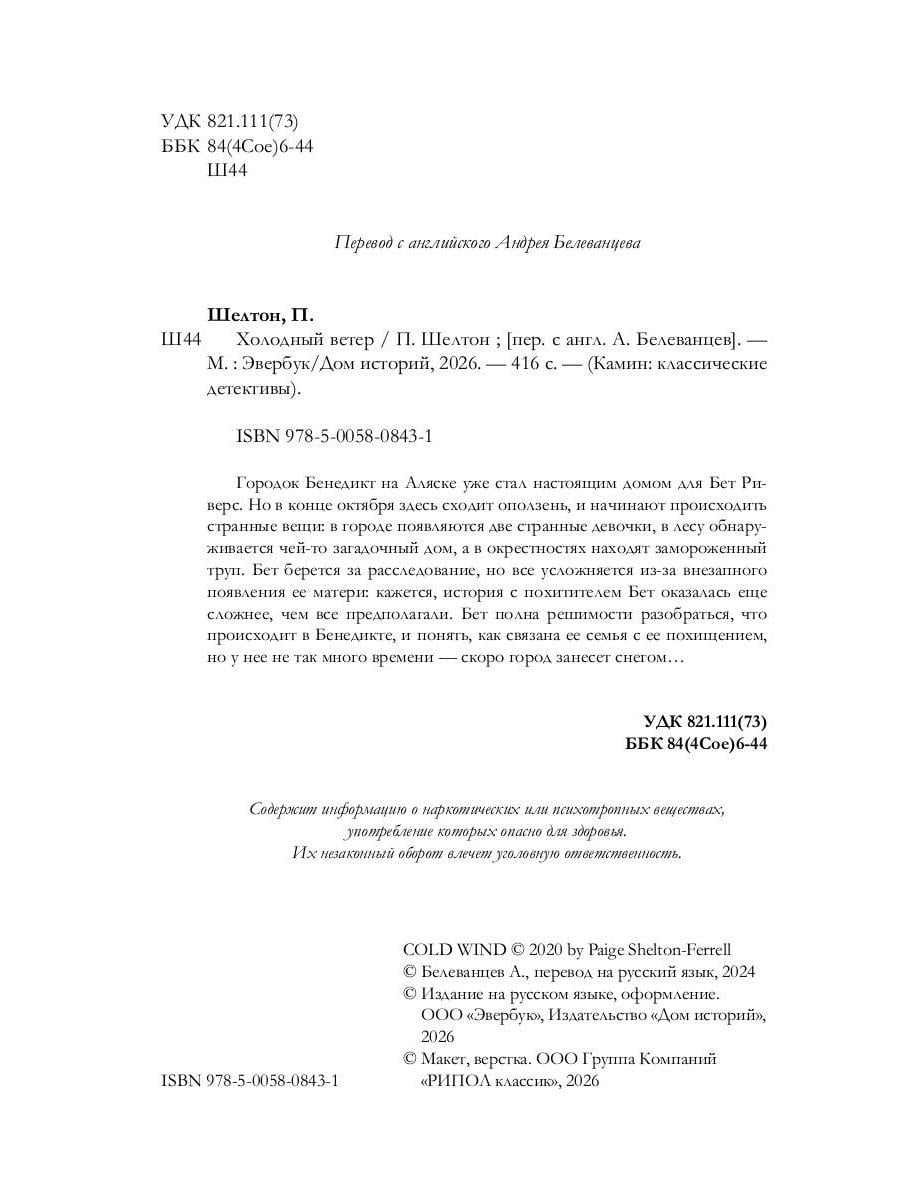 Городок Бенедикт на Аляске уже стал настоящим домом для Бет Риверс. Но в конце октября здесь сходит оползень, и начинают происходить странные вещи: в городе появляются две странные девочки, в лесу обнаруживается чей-то загадочный дом, а в окрестностях находят замороженный труп. Бет берется за расследование, но все усложняется из-за внезапного появления ее матери: кажется, история с похитителем Бет оказалась еще сложнее, чем все предполагали. Бет полна решимости разобраться, что происходит в Бенедикте, и понять, как связана ее семья с ее похищением, но у нее не так много времени - скоро город занесет снегом…| Издательство | Дом историй |