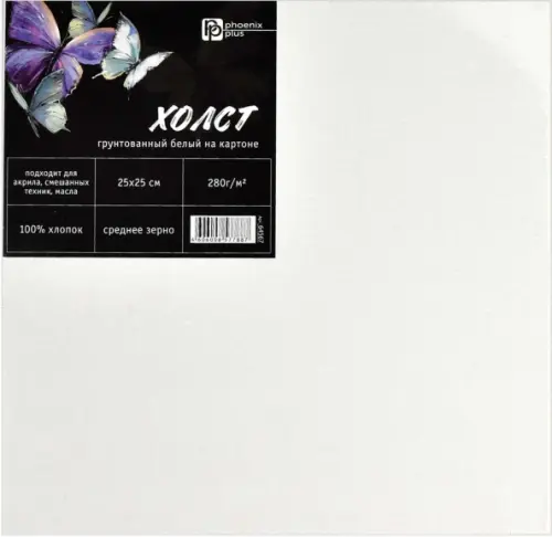 Холст художественный на картоне, белый, Феникс+ арт. 64567/50 БАБОЧКИ (25х25 см, хлопок 100%, 280г/м2, зерно: среднее, форма: квадратная, грунтованный, для акрила, масла, смешанных техник, место для персонализации, ПЭТ-плёнка).