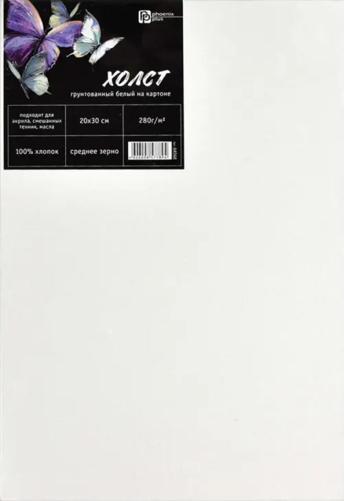 Холст художественный на картоне, белый, Феникс+ арт. 64568/50 БАБОЧКИ (20х30 см, хлопок 100%, 280г/м2, зерно: среднее, форма: прямоугольная, грунтованный, для акрила, масла, смешанных техник, место для персонализации, ПЭТ-плёнка).