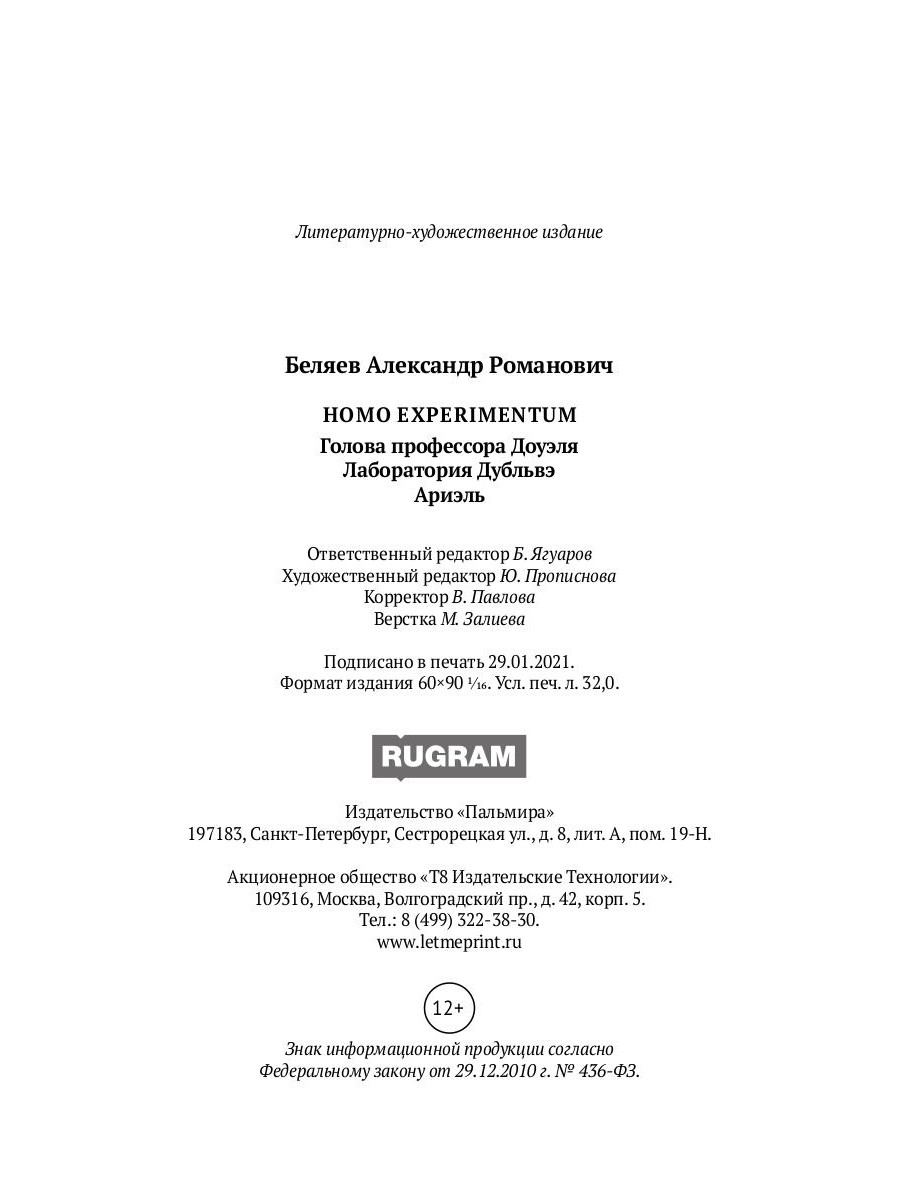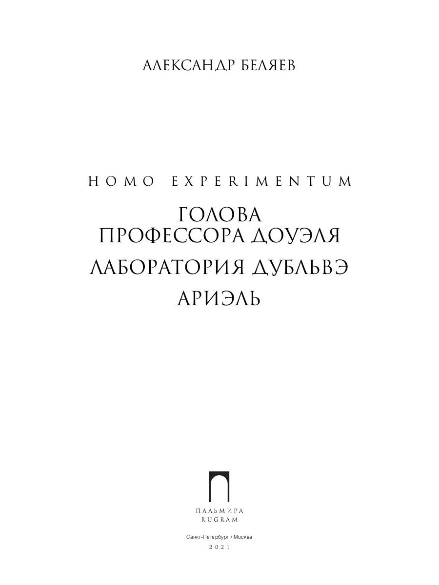 Аннотация: Homo experimentum. Голова профессора Доуэля. Лаборатория Дубльвэ. Ариэль: романы
