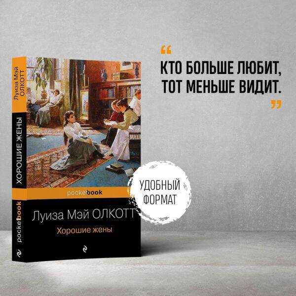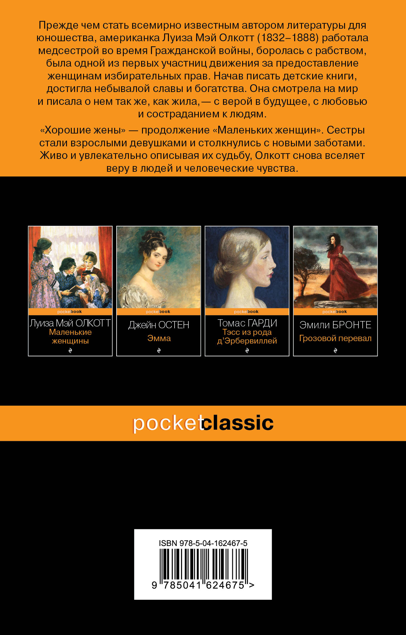 Старый друг лучше новых двух. С последней страницей «Маленьких женщин» история семейства Марч не закончилась. Мег, Джо, Бесс и Эми расцвели и из «маленьких» женщин превратились во взрослых девушек. Им предстоит выпорхнуть из семейного гнездышка и выбрать жизненный путь. Кто-то будет искать свое счастье, а кто-то - себя. Их ждут новые заботы, радостные моменты, романтические встречи и горечь утрат. Воздушные замки, построенные в детстве, начинают рушиться. Взрослый мир готовит новые испытания. Однако сестры не готовы терять надежду на лучшее. Станут ли они хорошими женами, как обещает название книги? Эта светлая книга вызывает улыбку, отвлекает от бед и погружает в атмосферу уюта и тепла. Роман способен поднять настроение читателям любого возраста. История семейства Марч была неоднократно перенесена на широкие экраны. Последняя экранизация 2019 года со звездами мирового масштаба в главных ролях покорила сердца зрителей и кинокритиков, а также была номинирована на «Оскар» в 6 категориях и получила награду за «Лучший дизайн костюмов».| Издательство | Эксмо |