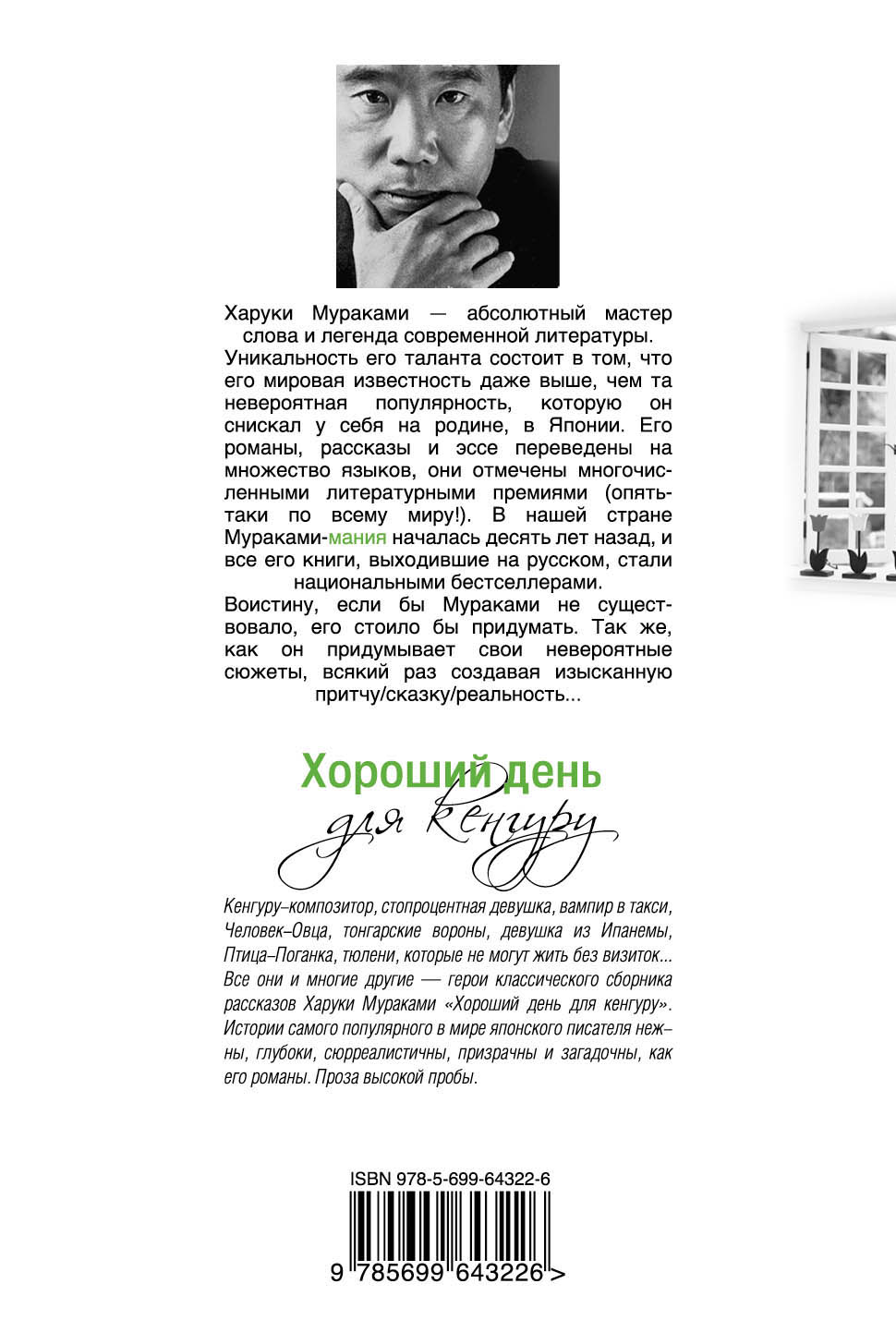 Кенгуру-композитор, стопроцентная девушка, вампир в такси, Человек-Овца, тонгарские вороны, девушка из Ипанемы, Птица-Поганка, тюлени, которые не могут жить без визиток. Все они и многие другие - герои классического сборника рассказов Харуки Мураками "Хороший день для кенгуру". Истории самого популярного в мире японского писателя нежны, глубоки, сюрреалистичны, призрачны и загадочны, как его романы. Проза высокой пробы.