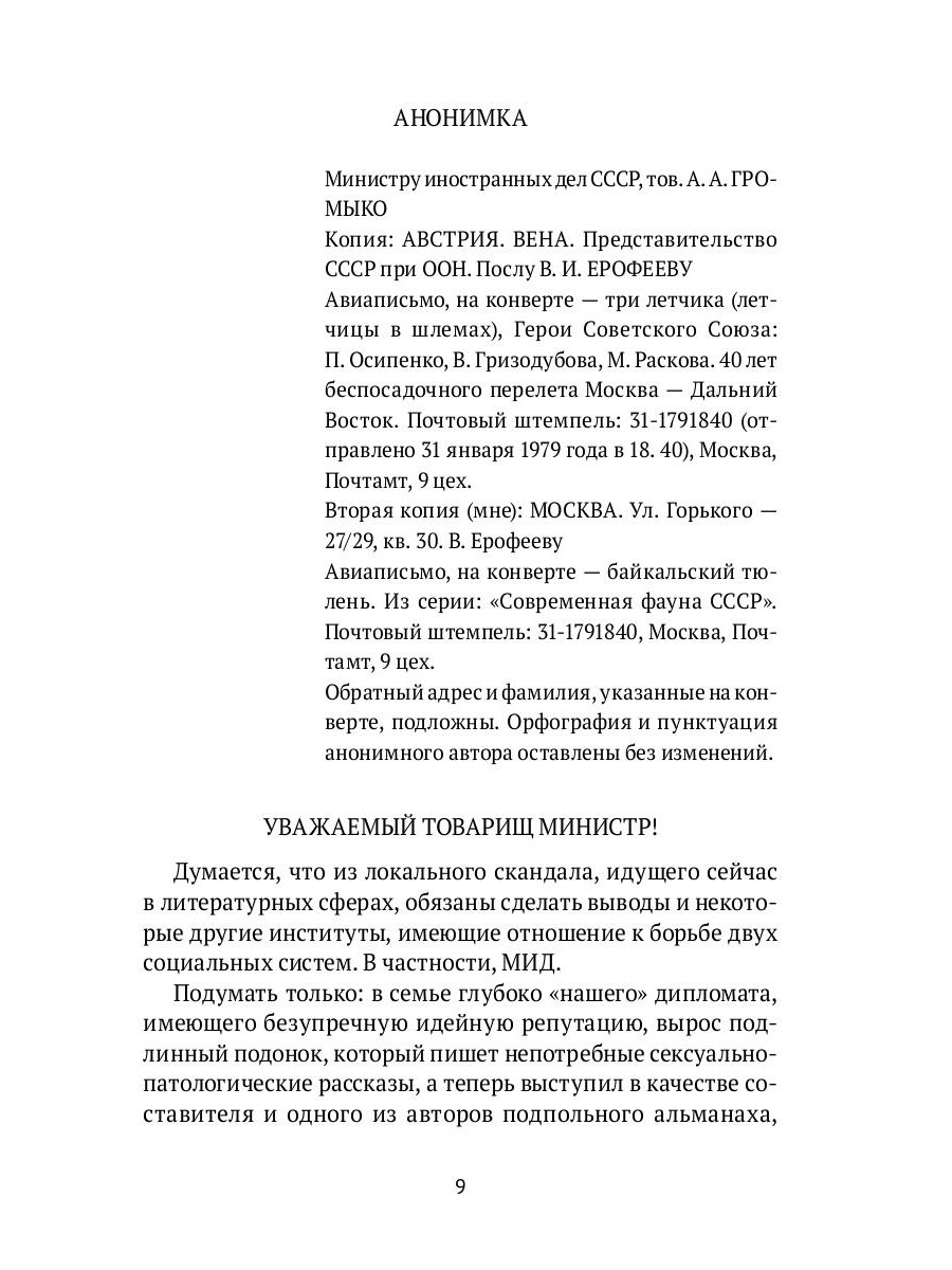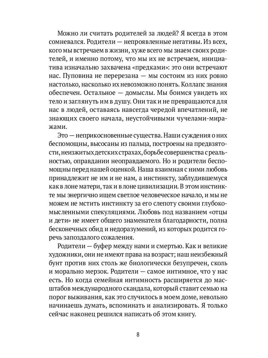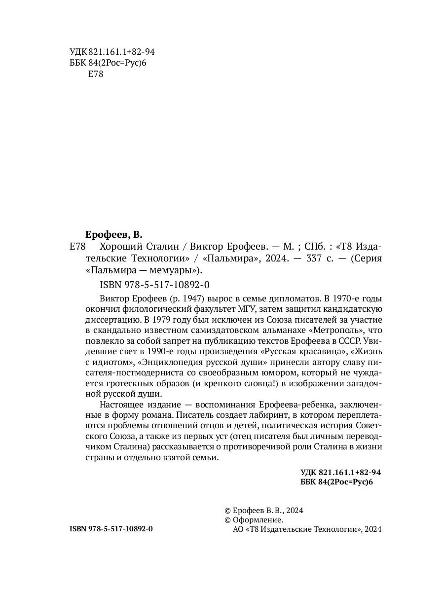 Виктор Ерофеев (р. 1947) вырос в семье дипломатов. В 1970-е годы окончил филологический факультет МГУ, затем защитил кандидатскую диссертацию. В 1979 году был исключен из Союза писателей за участие в скандально известном самиздатовском альманахе «Метрополь», что повлекло за собой запрет на публикацию текстов Ерофеева в СССР. Увидевшие свет в 1990-е годы произведения «Русская красавица», «Жизнь с идиотом», «Энциклопедия русской души» принесли автору славу писателя-постмодерниста со своеобразным юмором, который не чуждается гротескных образов (и крепкого словца!) в изображении загадочной русской души. Настоящее издание - воспоминания Ерофеева-ребенка, заключенные в форму романа. Писатель создает лабиринт, в котором переплетаются проблемы отношений отцов и детей, политическая история Советского Союза, а также из первых уст (отец писателя был личным переводчиком Сталина) рассказывается о противоречивой роли Сталина в жизни страны и отдельно взятой семьи.| Издательство | Т8 RUGRAM |
