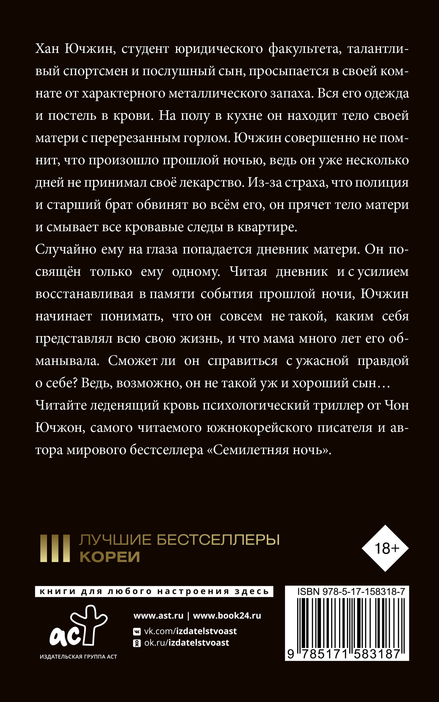 Хан Ючжин, студент юридического факультета, талантливый спортсмен и послушный сын, просыпается в своей комнате от характерного металлического запаха. Вся его одежда и постель в крови. На полу в кухне он находит тело своей матери с перерезанным горлом. Ючжин совершенно не помнит, что произошло прошлой ночью, ведь он уже несколько дней не принимал своё лекарство. Из-за страха, что полиция и старший брат обвинят во всём его, он прячет тело матери и смывает все кровавые следы в квартире. Случайно ему на глаза попадается дневник матери. Он посвящён только ему одному. Читая дневник и с усилием восстанавливая в памяти события прошлой ночи, Ючжин начинает понимать, что он совсем не такой, каким себя представлял всю свою жизнь, и что мама много лет его обманывала. Сможет ли он справиться с ужасной правдой о себе? Ведь, возможно, он не такой уж и хороший сын… Читайте леденящий кровь психологический триллер от Чон Ючжон, самого читаемого южнокорейского писателя и автора мирового бестселлера "Семилетняя ночь".| Издательство | Издательство "АСТ" |