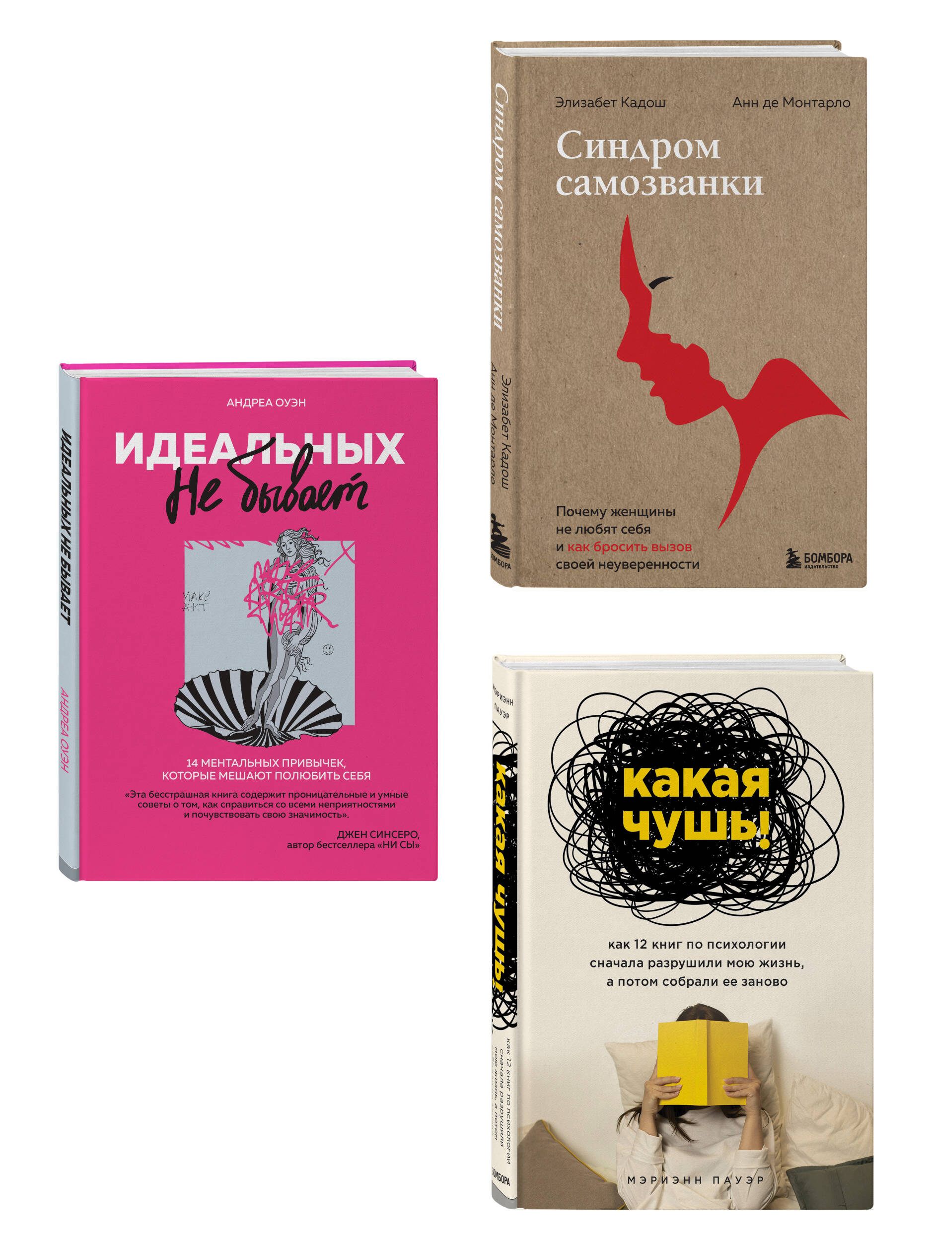«Хорошо, что ты такая, какая есть» комплект из трех мировых бестселлеров к любому гендерному празднику. "Синдром Самозванки". Что заставляет тебя сомневаться в своих действиях? Элизабет Кадош, автор образовательных книг, и Анн де Монтарло, психотерапевт с 14-летним опытом, провели масштабное исследование женской неуверенности в себе. Благодаря чему ты узнаешь, как развить критическое мышление, изменить отношение к своим ошибкам и перестать стремиться к чужому идеалу. "Идеальных не бывает". Автор этой книги, Андреа Оуэн, определила 14 привычек, которые помогают принять себя и поднять самооценку. Здесь ты найдешь подробные инструменты, чтобы узнать правду о себе и определить свои истинные желания и ценности. "Какая чушь". Марианна Пауэр много лет покупала известные бестселлеры по психологии, чтобы выяснить, действительно ли они помогают приблизиться к счастливой жизни. Как 12 книг сначала разрушили жизнь Марианны, а потом собрали ее заново?