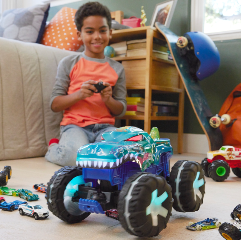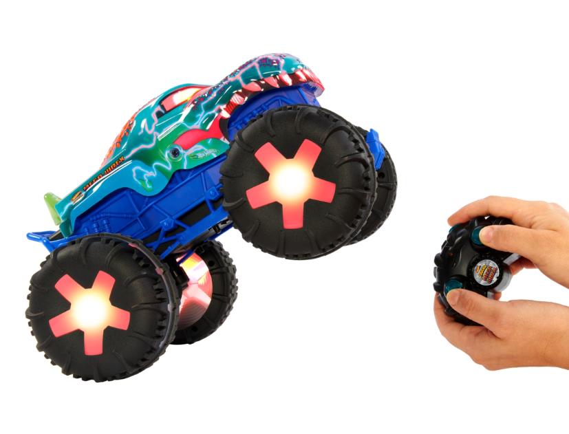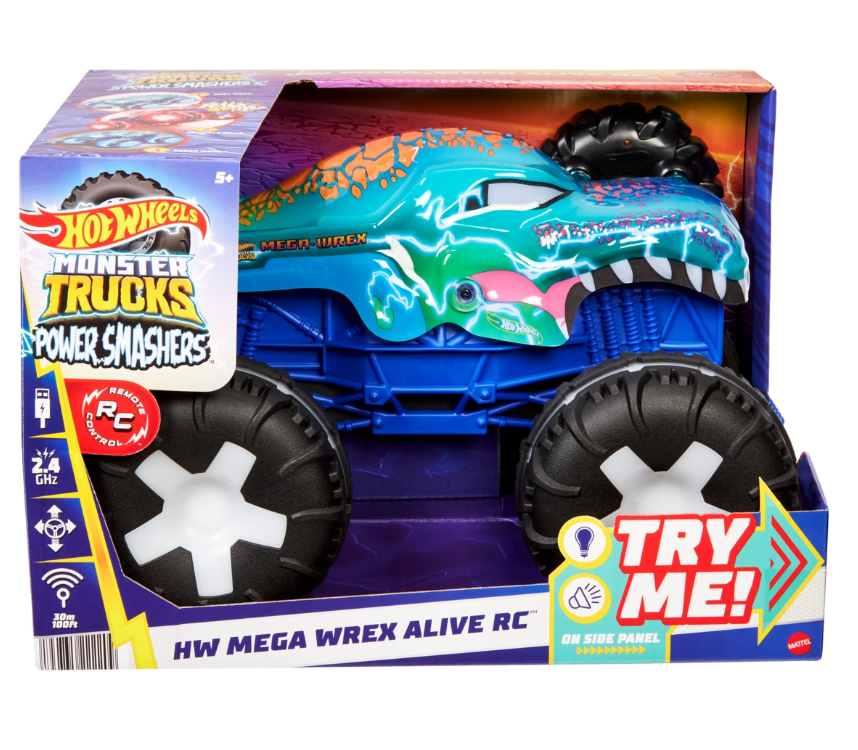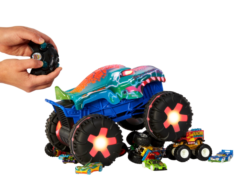 Монстр-трак Hot Wheels Мега-Рекс оживает в виде огромного автомобиля с дистанционным управлением, оснащенного интерактивными огнями и звуками.