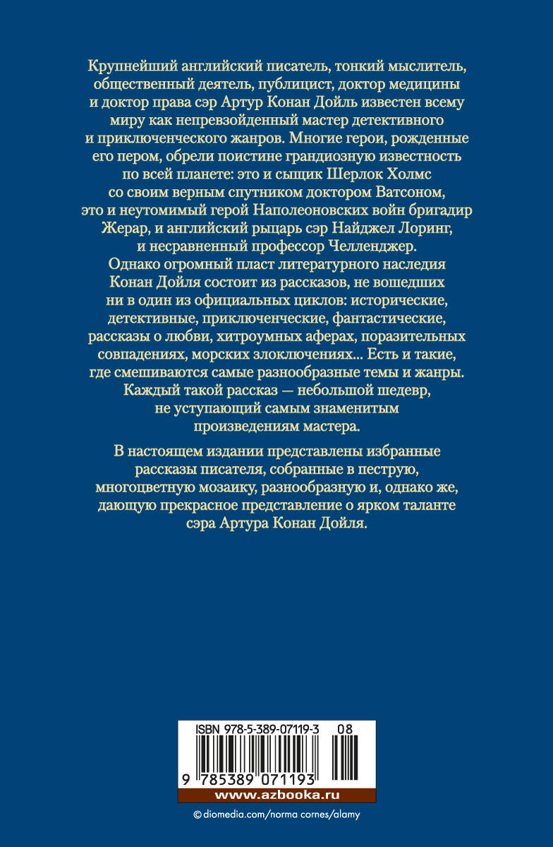 Крупнейший английский писатель, тонкий мыслитель, общественный деятель, публицист, доктор медицины и доктор права сэр Артур Конан-Дойль известен всему миру как непревзойденный мастер детективного и приключенческого жанров. Однако огромный пласт его литературного наследия состоит из рассказов, не вошедших ни в один из официальных циклов: исторические, детективные, приключенческие, фантастические, рассказы о любви, хитроумных аферах, поразительных совпадениях, морских злоключениях... Есть и такие, где смешиваются самые разнообразные темы и жанры. Каждый такой рассказ - небольшой шедевр, не уступающий самым знаменитым произведениям мастера. В настоящем издании представлены избранные рассказы писателя, собранные в пеструю, многоцветную мозаику, разнообразную и, однако же, дающую прекрасное представление о ярком таланте сэра Артура Конан-Дойля.| Издательство | Азбука-Аттикус Издат.группа ООО |