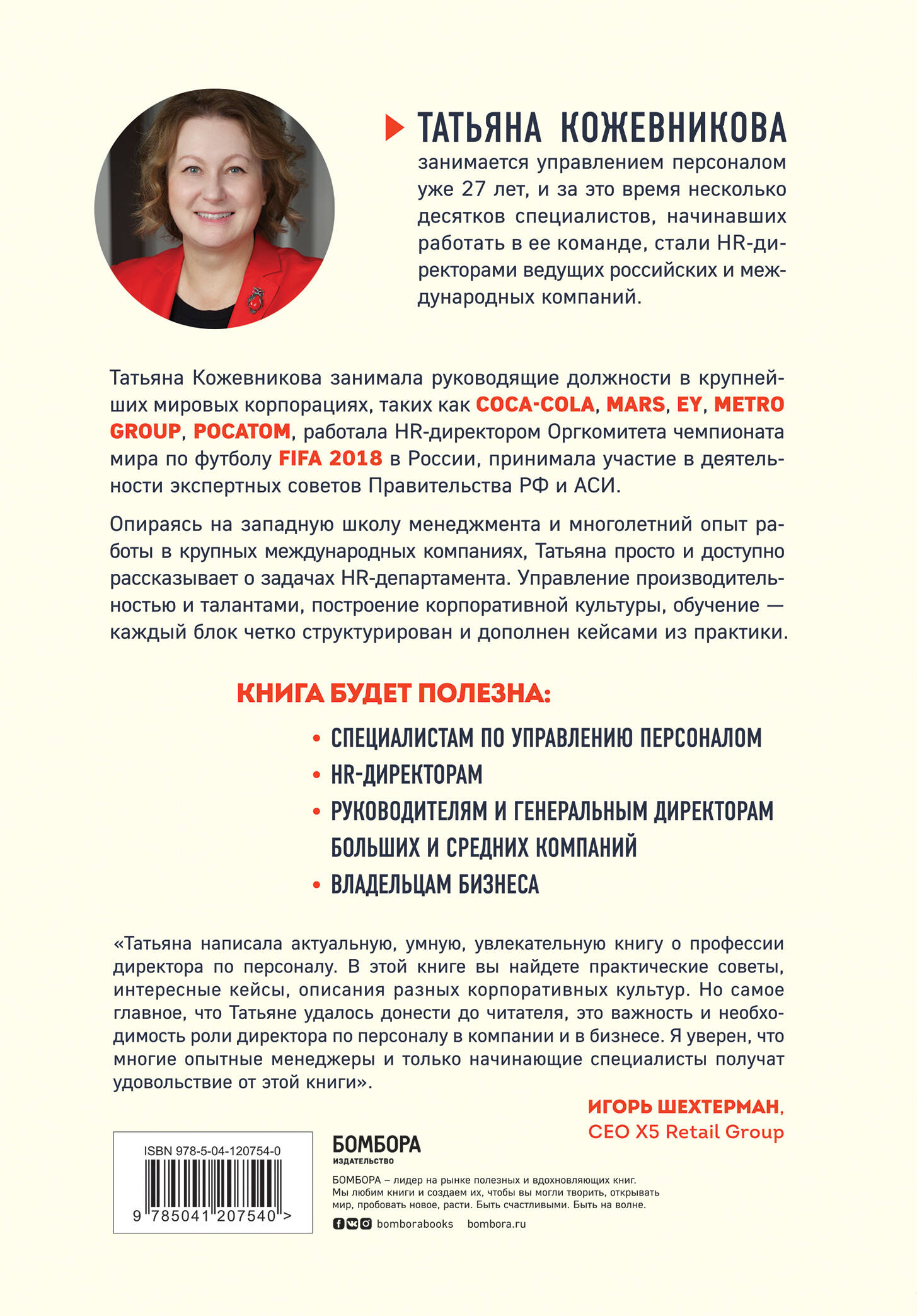 Татьяна Кожевникова занимается управлением персоналом уже 27 лет, и за это время несколько десятков специалистов, начинавших работать в её команде, стали HR директорами ведущих российских и международных компаний. В своей книге Татьяна структурированно рассказывает, как работают HR- департаменты в крупных международных компаниях , как изменилась сфера HR после пандемии, разбирает кейсы из личной практики и дает пошаговую инструкцию как стать HR директором. Книга будет полезна: • Специалистам по управлению персоналом • HR - директорам • Руководителям и генеральным директорам больших и средних компаний • Владельцам бизнеса| Издательство | ООО "Издательство "Эксмо" |