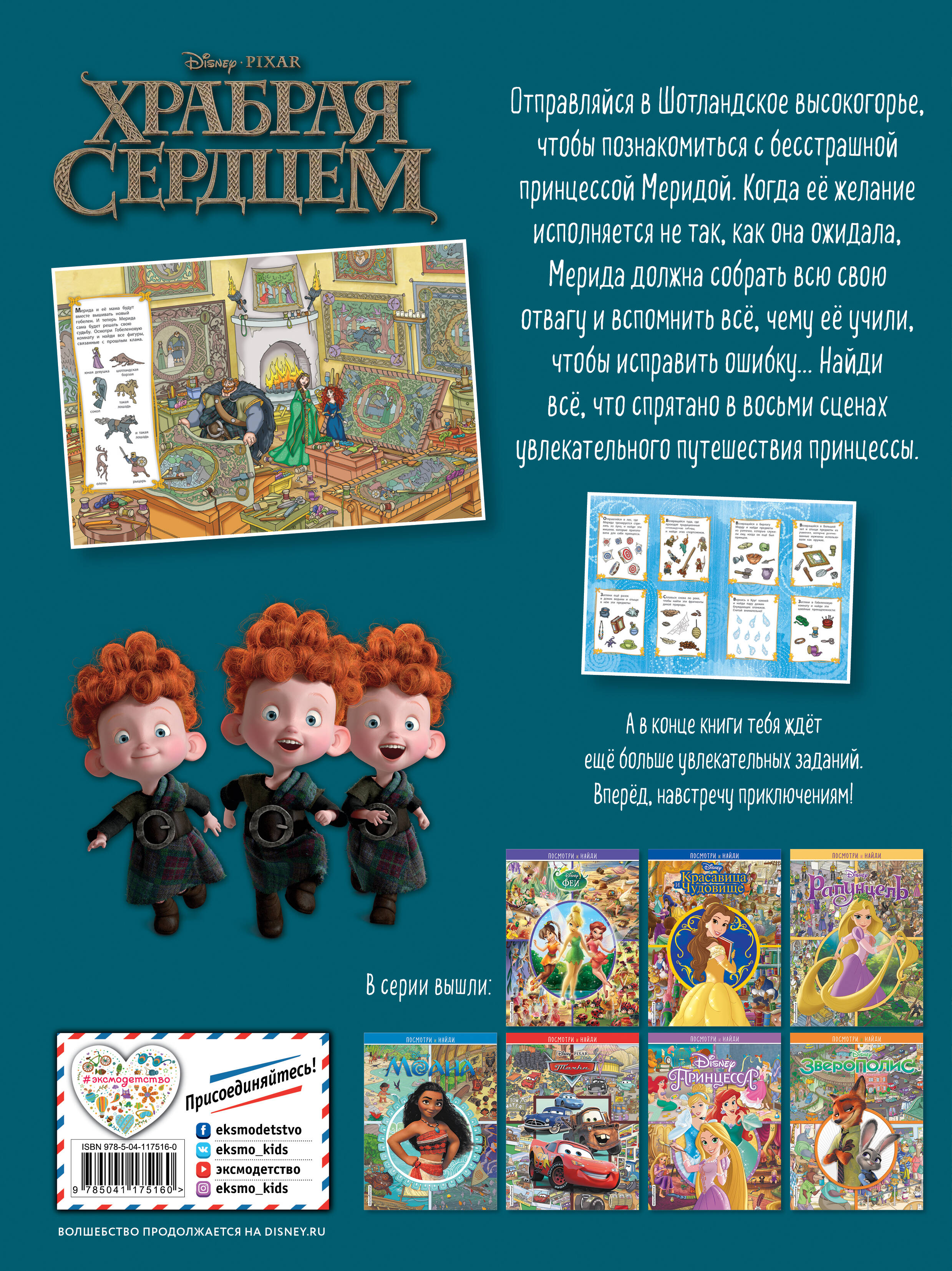 Отправляйся в Шотландское высокогорье, чтобы познакомиться с бесстрашной принцессой Меридой. Когда её желание исполняется не так, как она ожидала, Мерида должна собрать всю свою отвагу и вспомнить всё, чему её учили, чтобы исправить ошибку… Найди всё, что спрятано в восьми сценах увлекательного путешествия принцессы. А в конце книги тебя ждёт ещё больше увлекательных заданий. Вперёд, навстречу приключениям!| Издательство | ООО "Издательство "Эксмо" |