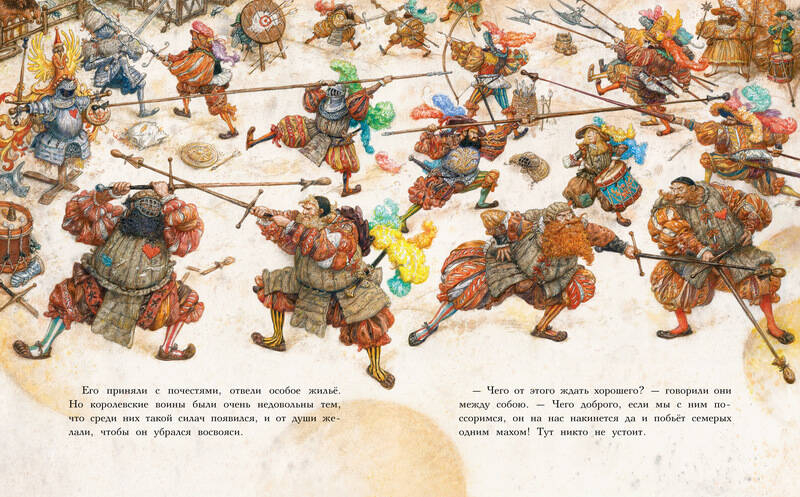 Этот удалец легко расправляется со злобными великанами, укрощает свирепого единорога и загоняет в ловушку огромного вепря. А если попросите, он сошьёт вам брюки и жилет, да такие, что прямо загляденье. У храбреца на поясе вышит знаменитый девиз: "Одним махом семерых побивахом!" Конечно, вы уже узнали храброго портняжку из сказки братьев Гримм. Но старый знакомый найдёт, чем удивить и в этот раз - ведь таким вы его ещё не видели! Яркие, пышные костюмы, забавные и жутковатые физиономии, захватывающая игра и безудержное веселье - всё это вы увидите и почувствуете в новых иллюстрациях блестящего мастера книжной графики Антона Ломаева. Детям до 3-х лет.