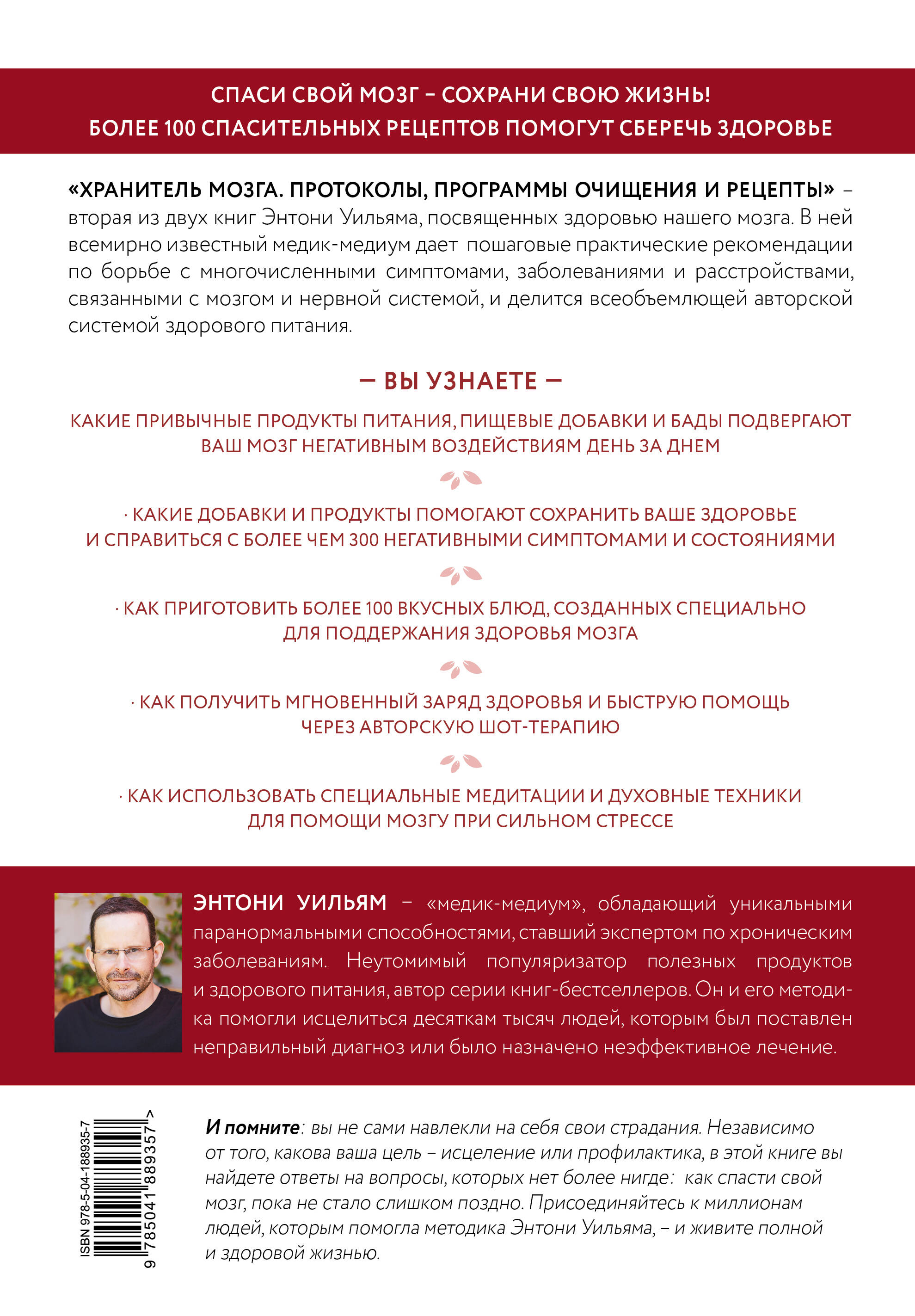 «ХРАНИТЕЛЬ МОЗГА. Протоколы, программы очищения и рецепты» - вторая из двух книг Энтони Уильяма, посвященных здоровью нашего мозга. В ней всемирно известный медик-медиум дает пошаговые практические рекомендации по борьбе с многочисленными симптомами, заболеваниями и расстройствами, связанными с мозгом и нервной системой, и делится всеобъемлющей авторской системой здорового питания. ВЫ УЗНАЕТЕ: • Какие привычные продукты питания, пищевые добавки и БАДы подвергают ваш мозг негативным воздействиям день за днем. • Какие добавки и продукты помогают сохранить ваше здоровье и справиться с более чем 300 негативными симптомами и состояниями. • Как приготовить более 100 вкусных блюд, созданных специально для поддержания здоровья мозга. • Как получить мгновенный заряд здоровья и быструю помощь через авторскую шот-терапию. • Как использовать специальные медитации и духовные техники для помощи мозгу при сильном стрессе. ЭНТОНИ УИЛЬЯМ - «медик-медиум», обладающий уникальными паранормальными способностями, ставший экспертом по хроническим заболеваниям. Неутомимый популяризатор полезных продуктов и здорового питания, автор серии книг-бестселлеров. Он и его методика помогли исцелиться десяткам тысяч людей, которым был поставлен неправильный диагноз или было назначено неэффективное лечение.| Издательство | ООО "Издательство "Эксмо" |