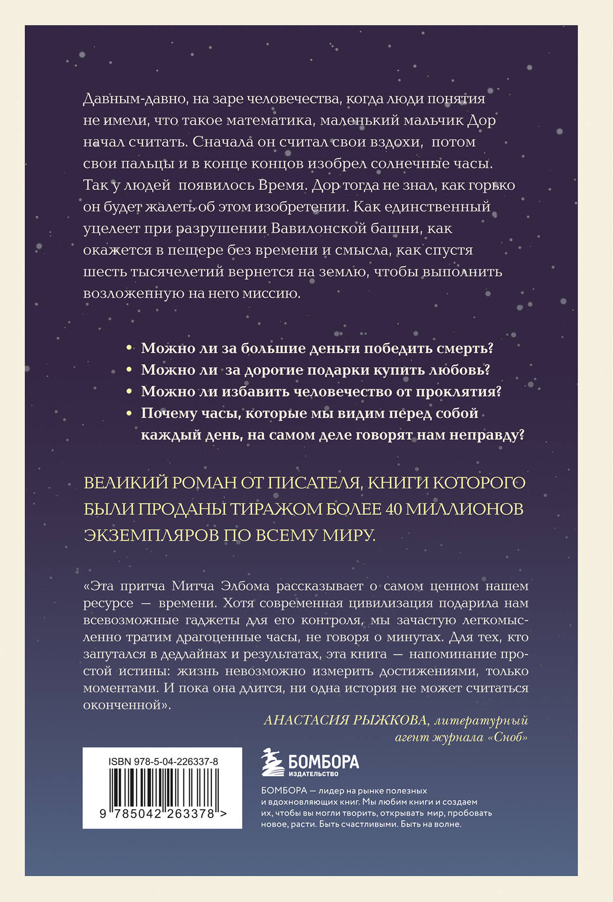 Давным-давно, на заре человечества, когда люди понятия не имели, что такое математика, маленький мальчик Дор начал считать. Сначала он считал свои вздохи, потом свои пальцы, и в конце концов изобрел солнечные часы. Так у людей появилось Время. Дор тогда не знал, как горько он будет жалеть об этом изобретении. Как единственный уцелеет при разрушении Вавилонской башни, как окажется в пещере без времени и смысла, как спустя шесть тысячелетий вернется на Землю, чтобы выполнить возложенную на него миссию. Дору предстоит познакомиться со старшеклассницей Сарой Лемон и 82-летним миллионером Виктором Деламонтом, которым предначертано узнать секреты Времени, постичь тайны бессмертия и осознать, для чего же человеческая жизнь имеет свое начало и конец. Можно ли за большие деньги победить смерть? Можно ли за дорогие подарки купить любовь? Можно ли избавить человечество от проклятия? Почему часы, которые мы видим перед собой каждый день, на самом деле говорят нам неправду? Великий роман от писателя, книги которого были проданы тиражом более 40 миллионов экземпляров по всему миру. «Эта притча Митча Элбома рассказывает о самом ценном нашем ресурсе - времени. Хотя современная цивилизация подарила нам всевозможные гаджеты для его контроля, мы зачастую легкомысленно тратим драгоценные часы, не говоря о минутах. Для тех, кто запутался в дедлайнах и результатах, эта книга - напоминание простой истины: жизнь невозможно измерить достижениями, только моментами. И пока она длится, ни одна история не может считаться оконченной». - Анастасия Рыжкова, литературный агент snob| Издательство | ООО "Издательство "Эксмо" |