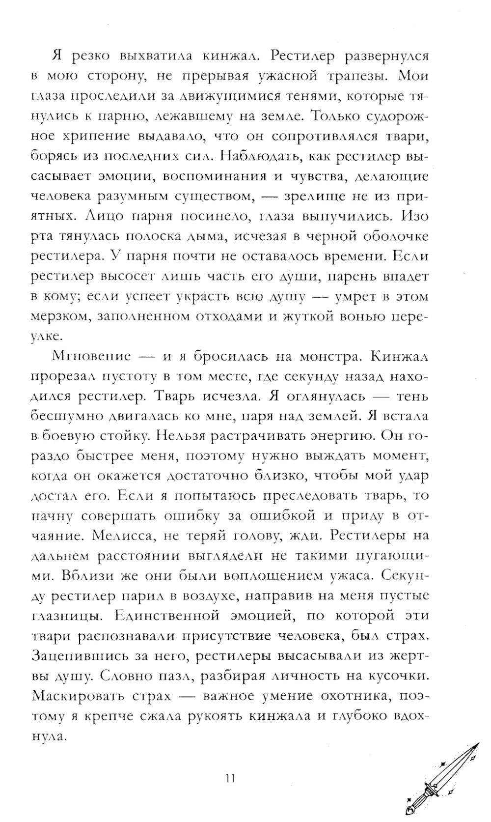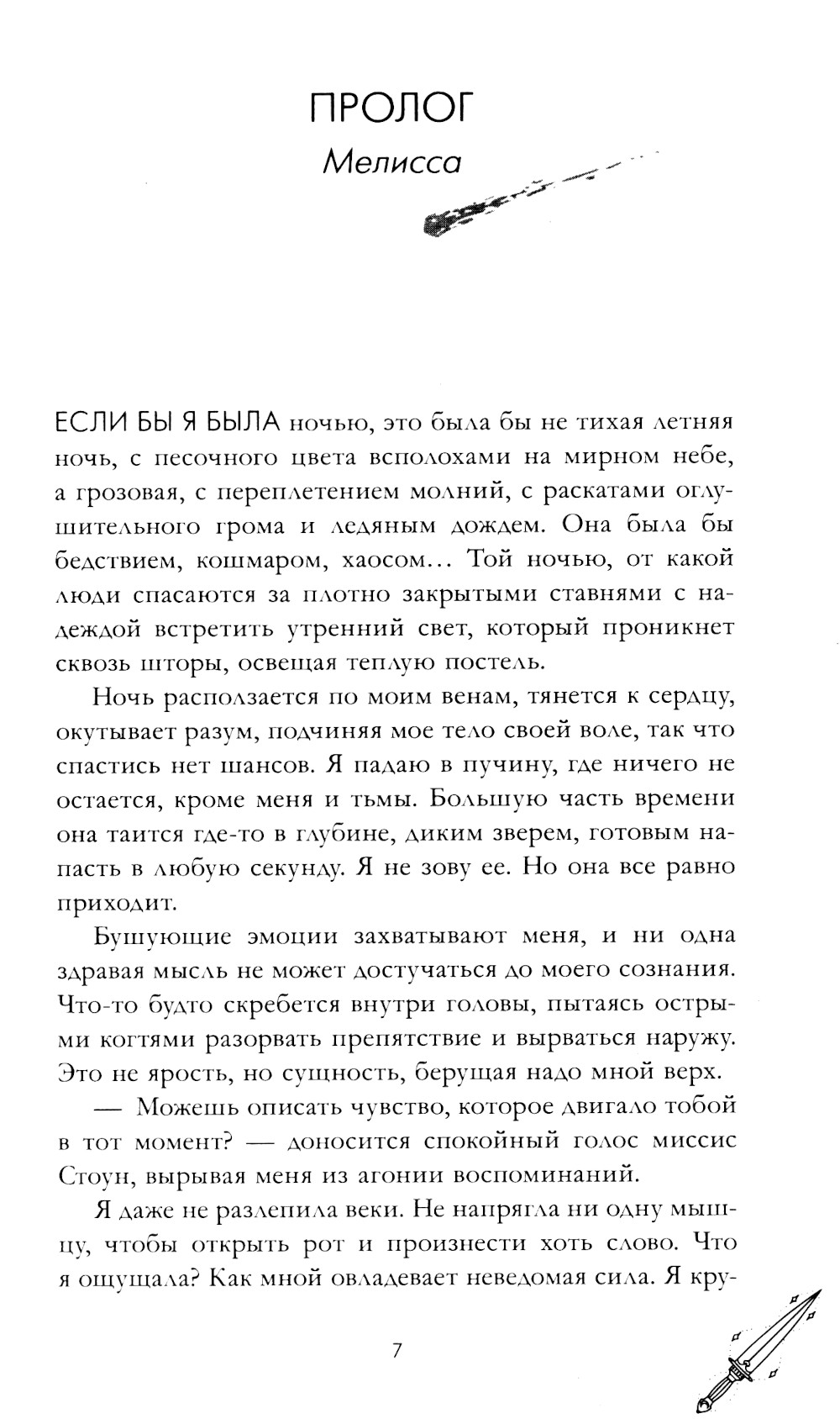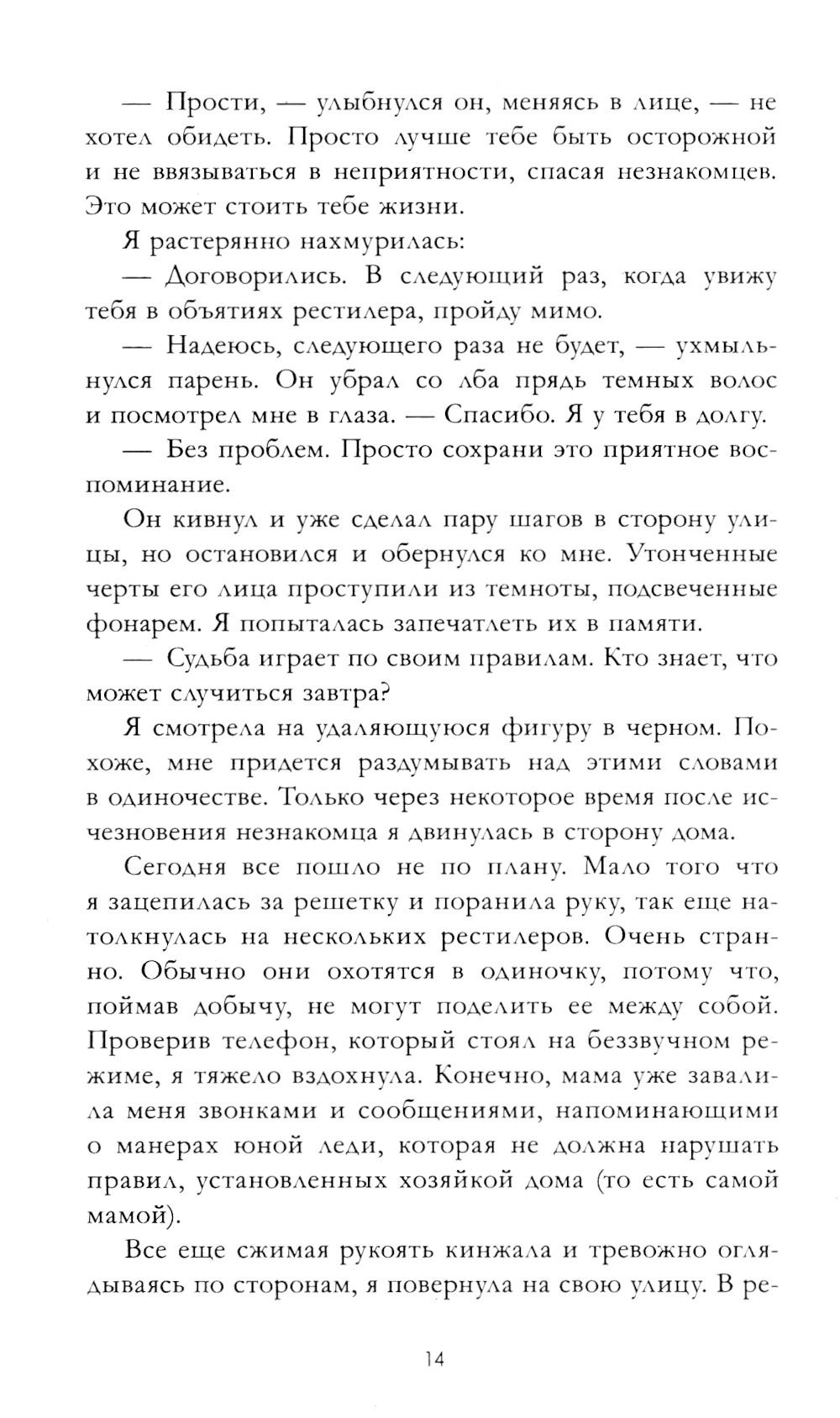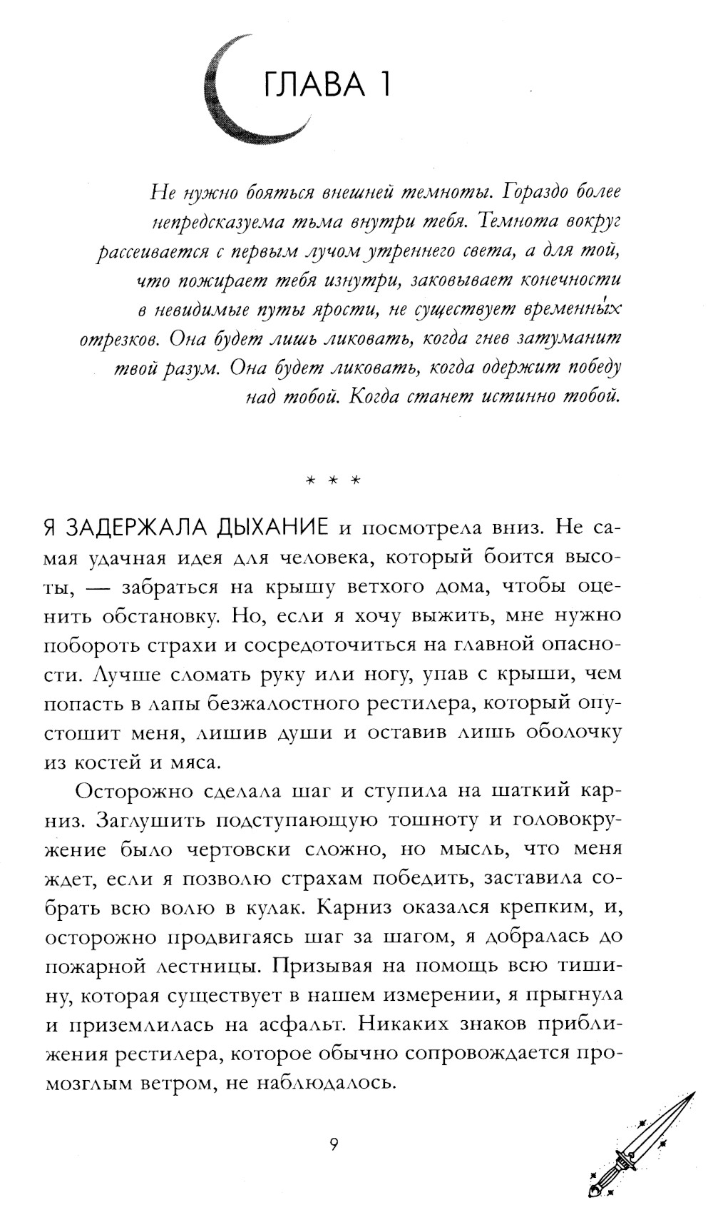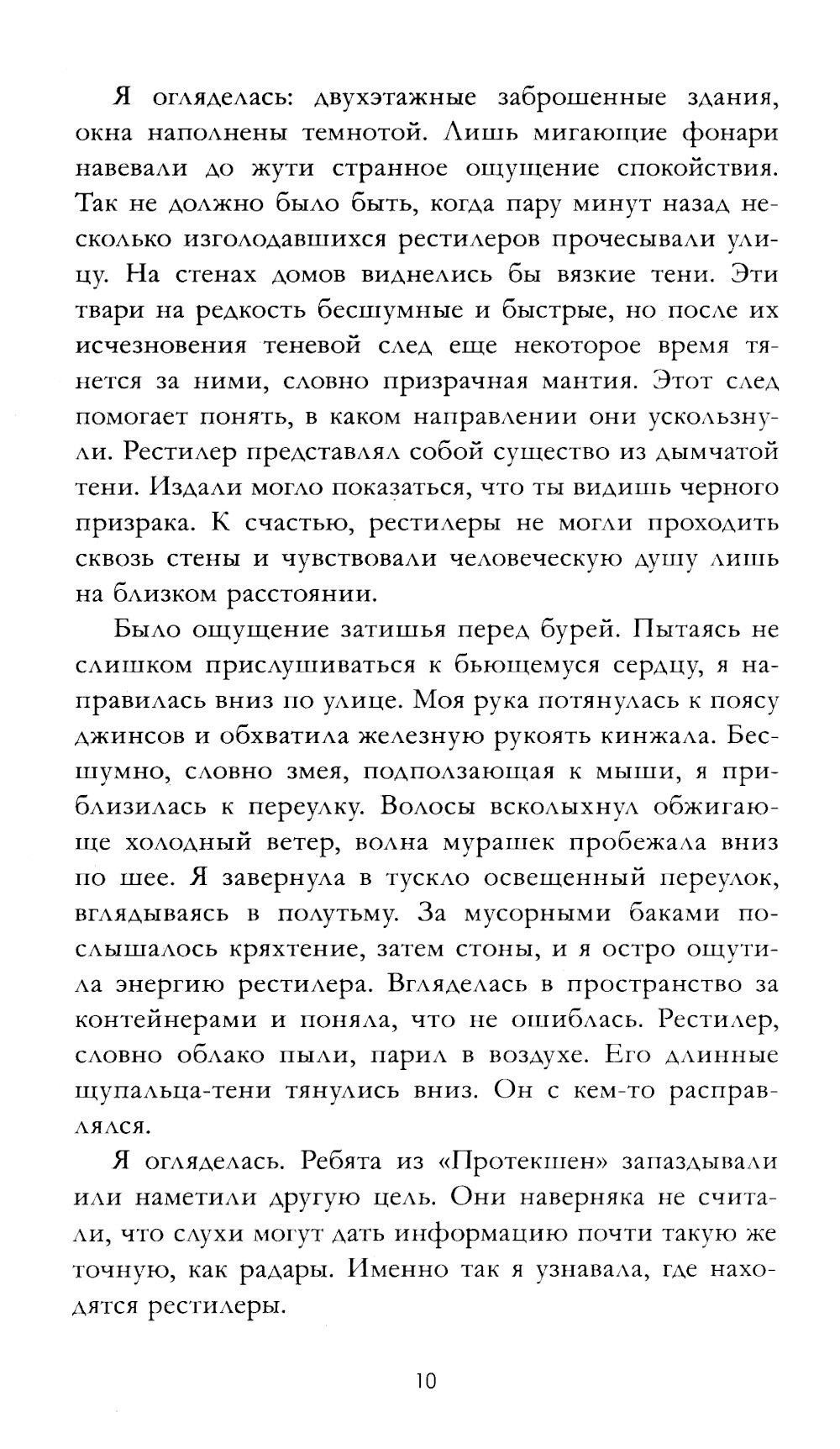 Мелисса - прирожденная охотница, умение бороться с рестилерами у нее в крови. Она ждет наступления темноты, чтобы раз за разом убивать потусторонних тварей, высасывающих из людей жизнь. Мелисса - одиночка, поэтому учеба в элитной академии Дэвинфоллд, где готовят охотников на рестилеров, становится для нее испытанием. Особенно когда она попадает на Турнир теней, участники которого коварны, хитры и мстительны. Кажется, здесь у каждого есть секрет... И особенно много их у главы спецотряда по борьбе с рестилерами Арли Блэка. Он враждует с Мелиссой или дружит? Он ненавидит ее или защищает? Почему каждая встреча с ним оборачивается для ее души самой черной ночью?| Издательство | Клевер-Медиа-Групп |