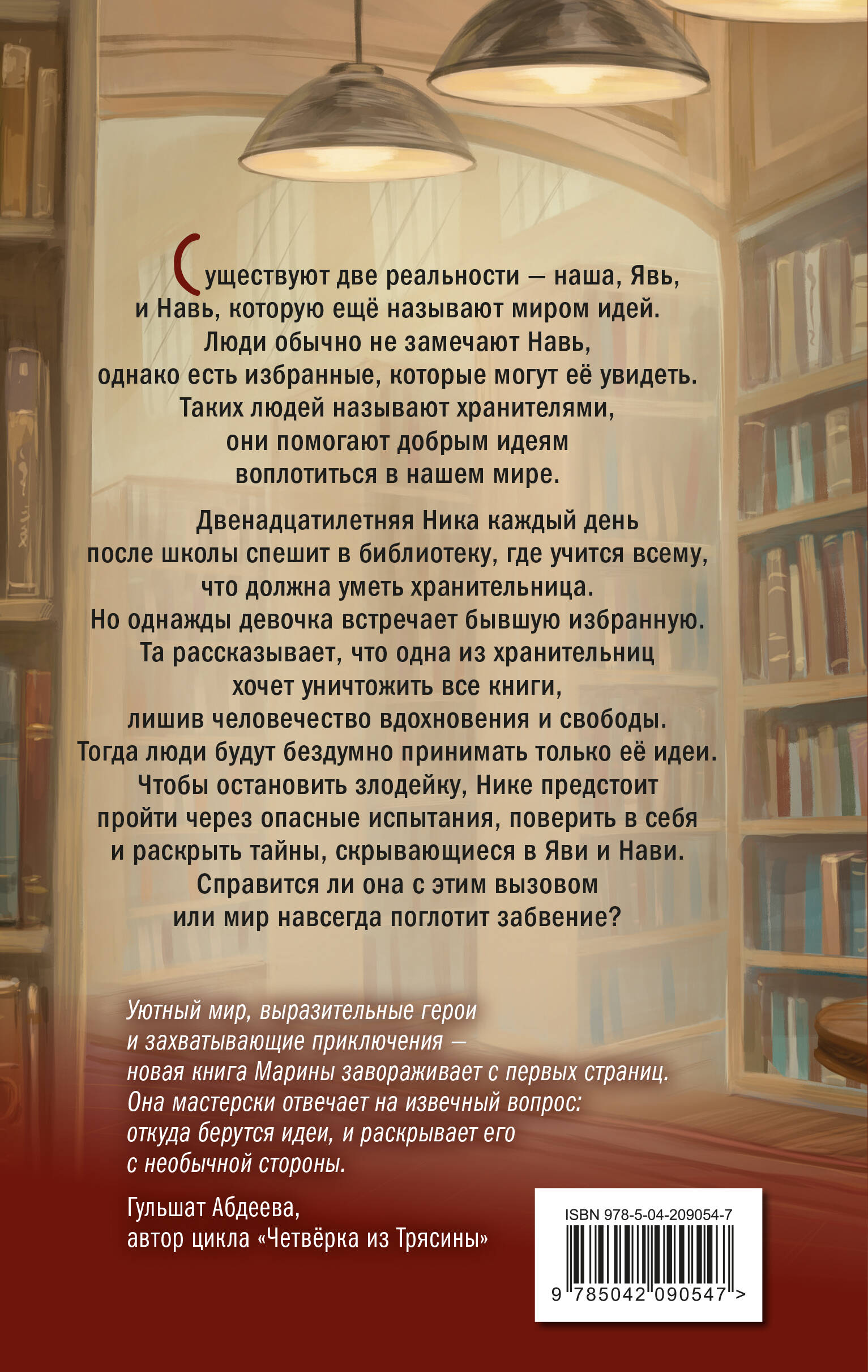 Для любителей «Ночных тетрадей», серии про Арчи Грина и приключений в библиотеках! Однажды Ника придумала сюжет для романа, и в ее жизни тут же начались головокружительные приключения! Теперь Ника - избранная. Она помогает идеям воплотиться в нашем мире, и это непростая работа. Всегда есть те, кто не любит творчество, ненавидит книги и готов уничтожить все воображаемые миры. Как же с ними справиться? Марина Жильцова - профессиональный детский психолог и член Союза детских и юношеских писателей. Она поможет понять, как работает воображение и что нужно для вдохновения. Ее книги для детей и подростков не только увлекательны, но и полны воодушевления. Уютная история про воображение, запах старых книг и разноглазого кота. Книга подходит для читателей от 9 лет.| Издательство | ООО "Издательство "Эксмо" |
