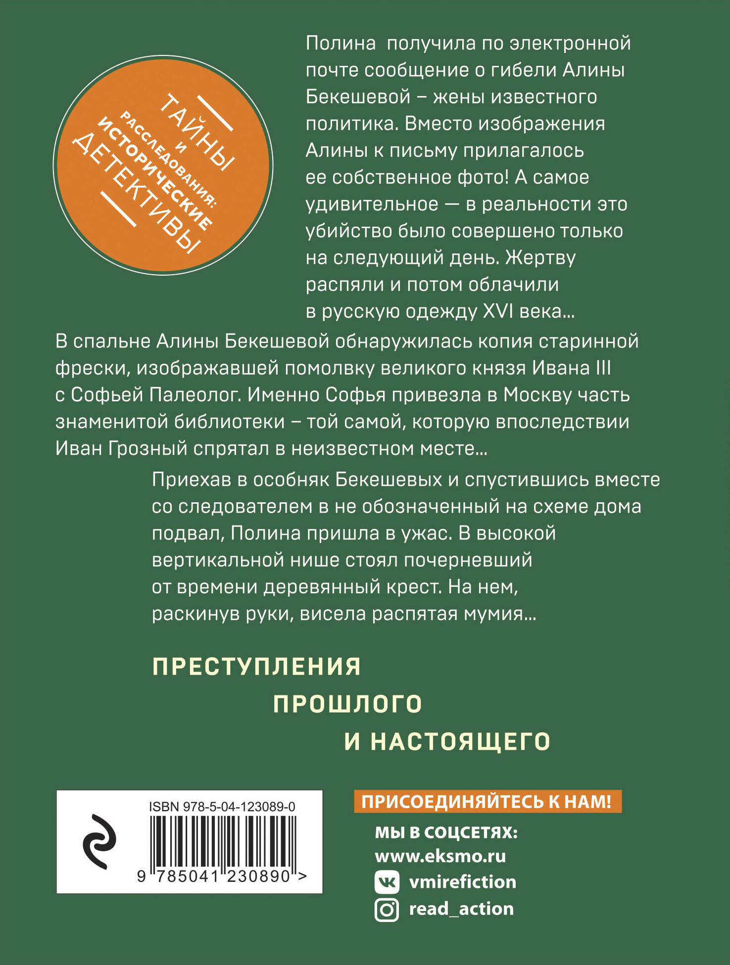 Полина получила по электронной почте сообщение о гибели Алины Бекешевой - жены известного политика. Вместо изображения Алины к письму прилагалось ее собственное фото! А самое удивительное - в реальности это убийство было совершено только на следующий день. Жертву распяли, и потом облачили в русскую одежду XVI века… В спальне Алины Бекешевой обнаружилась копия старинной фрески, изображавшей помолвку великого князя Ивана III c Софьей Палеолог. Именно Софья привезла в Москву часть знаменитой библиотеки - той самой, которую впоследствии Иван Грозный спрятал в неизвестном месте… Приехав в особняк Бекешевых и спустившись вместе со следователем в не обозначенный на схеме дома подвал, Полина пришла в ужас. В высокой вертикальной нише стоял почерневший от времени деревянный крест. На нем, раскинув руки, висела распятая мумия… В остросюжетных романах из серии «Тайны и расследования: исторический детектив» действие развивается в прошлом и настоящем. Любителей криминальных загадок, связанных с артефактами и историческими тайнами, ждут захватывающие книги ведущих российских авторов.| Издательство | ООО "Издательство "Эксмо" |