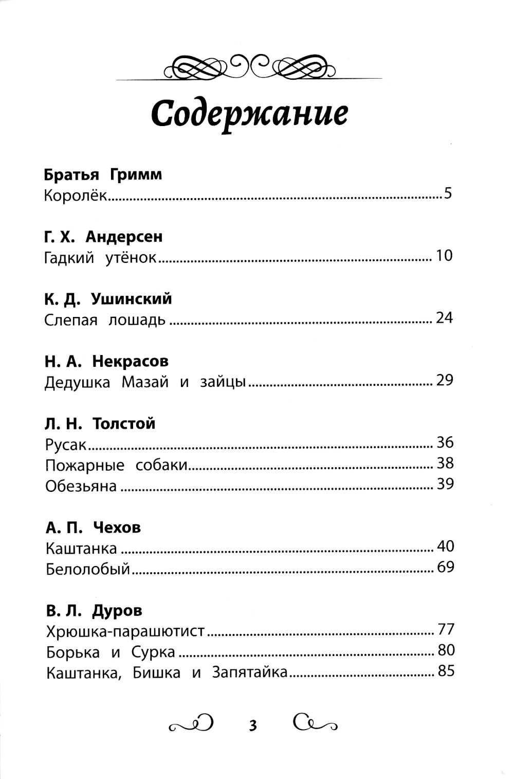 В этой хрестоматии мы собрали интересные истории про животных: и выдуманные, и те, которые на самом деле случились когда-то. Мы выбрали произведения сказочников (братьев Гримм, Г. X. Андерсена, Р. Киплинга), замечательного педагога К. Д. Ушинского, поэтов Н. А. Некрасова, В. В. Маяковского, мастеров отечественной прозы Л. Н. Толстого и А. П. Чехова, А. И. Куприна и Л. Н. Андреева, Саши Чёрного, а также путешественника Б. С. Житкова и дрессировщика В. Л. Дурова - они хорошо знали животных и отлично понимали, что детям интересны их проказы и приключения, опасные, забавные, смешные и трогательные ситуации, в которые те попадают.