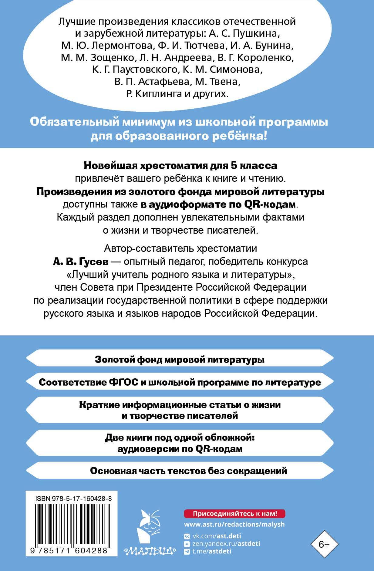 Какую хрестоматию подобрать для современного школьника? Как помочь ему освоить программу по литературе? Новейшая хрестоматия для 5 класса -- это уникальный интерактивный формат, который поможет ребятам легко освоить школьный курс литературы. В хрестоматию вошли произведения из золотого фонда мировой литературы: А. С. Пушкина, М. Ю. Лермонтова, И. А. Бунина, Н. В. Гоголя, Марка Твена, Р. Киплинга и многих других выдающихся писателей. Все произведения отобраны в соответствии с программой по литературе для средней школы. Полные аудиоверсии произведений доступны по QR-коду. Автор-составитель А. В. Гусев - опытный педагог, победитель конкурса «Лучший учитель родного языка и литературы», член Совета при Президенте РФ по реализации государственной политики в сфере поддержки русского языка и языков народов России дополнил каждый раздел краткими информационными статьями о жизни и творчестве писателей. Также по QR-кодам доступны дополнительные материалы, которые познакомят юного читателя с культурным наследием, помогут расширить кругозор и привить любовь к литературе. Хрестоматия станет отличным помощником для каждого школьника перед подготовкой к экзаменам и сочинениям.