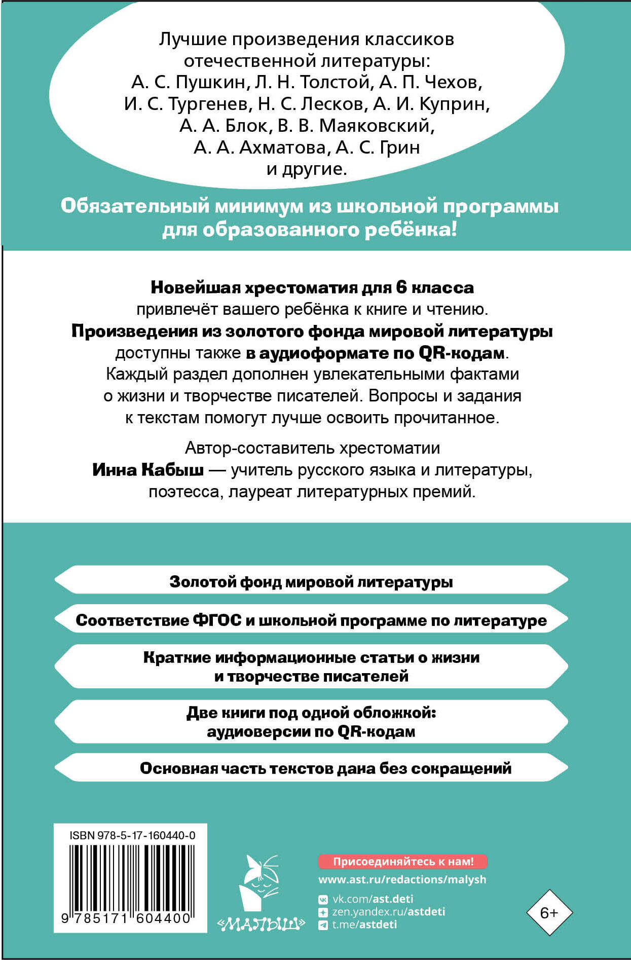 Какой должна быть современная хрестоматия школьника? Как помочь ему освоить программу и полюбить литературу? Новейшая хрестоматия для 6 класса -- это уникальный интерактивный формат, который совмещает две книги под одной обложкой. В хрестоматию вошли произведения из золотого фонда мировой литературы: А. С. Пушкина, И. С. Тургенева, Л. Н. Толстого, А. П. Чехова, Е. С. Есенина, А. С. Грина, Б. Н. Полевого и многих других выдающихся писателей. Все произведения отобраны в соответствии с программой по литературе. Полные аудиоверсии произведений доступны по QR-коду. Автор-составитель Инна Кабыш - учитель русского языка и литературы, поэт, лауреат многочисленных премий дополнила каждый раздел краткими информационными статьями о жизни и творчестве писателей. Также по QR-кодам доступны дополнительные материалы, которые познакомят юного читателя с культурным наследием, помогут расширить кругозор и привить любовь к литературе. Хрестоматия станет отличным помощником для каждого школьника перед подготовкой к экзаменам и сочинениям.| Издательство | Издательство "АСТ" |