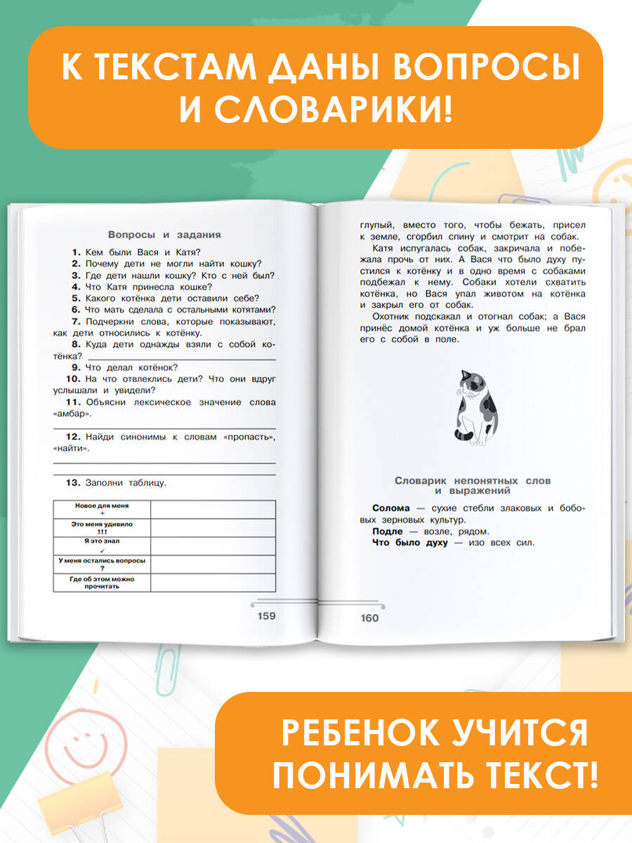 Занимаясь по этой книге, ребёнок будет глубже понимать текст, научится определять тему и главную мысль произведения, рассуждать о прочитанном и формулировать собственное мнение. • Хрестоматия + практикум. • Использованы тексты произведений, рекомендованных для изучения в 1 классе. • Методическое сопровождение по эффективной методике Ольги Узоровой - подробное объяснение, как работать с текстами. • К текстам произведений даны вопросы и словарики непонятных слов и выражений. • В конце книги - ответы на вопросы, которые могут вызвать затруднения.