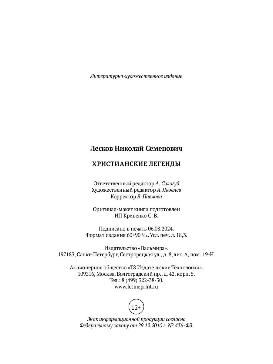 Николай Семенович Лесков в своем творчестве исследует крупные народные характеры. Чем жив русский человек, что есть закон Божий, какова природа добра и зла, греха и праведности - вот круг вопросов, занимающих автора. В 1880-е Лесков обращается к сюжетам и мотивам древнерусского житийного сборника «Прoлог», из чего вырастает целое направление в творчестве автора, к которому относятся девять Христианских легенд, публикуемых в настоящем издании. Этические вопросы, поднятые Лесковым, продолжают волновать читателя по сей день. Благодаря глубокой проработке характеров и разнообразию языковой палитры цикл легенд занимает заслуженное место среди шедевров русской литературы на христианскую тему.| Издательство | Т8 RUGRAM |