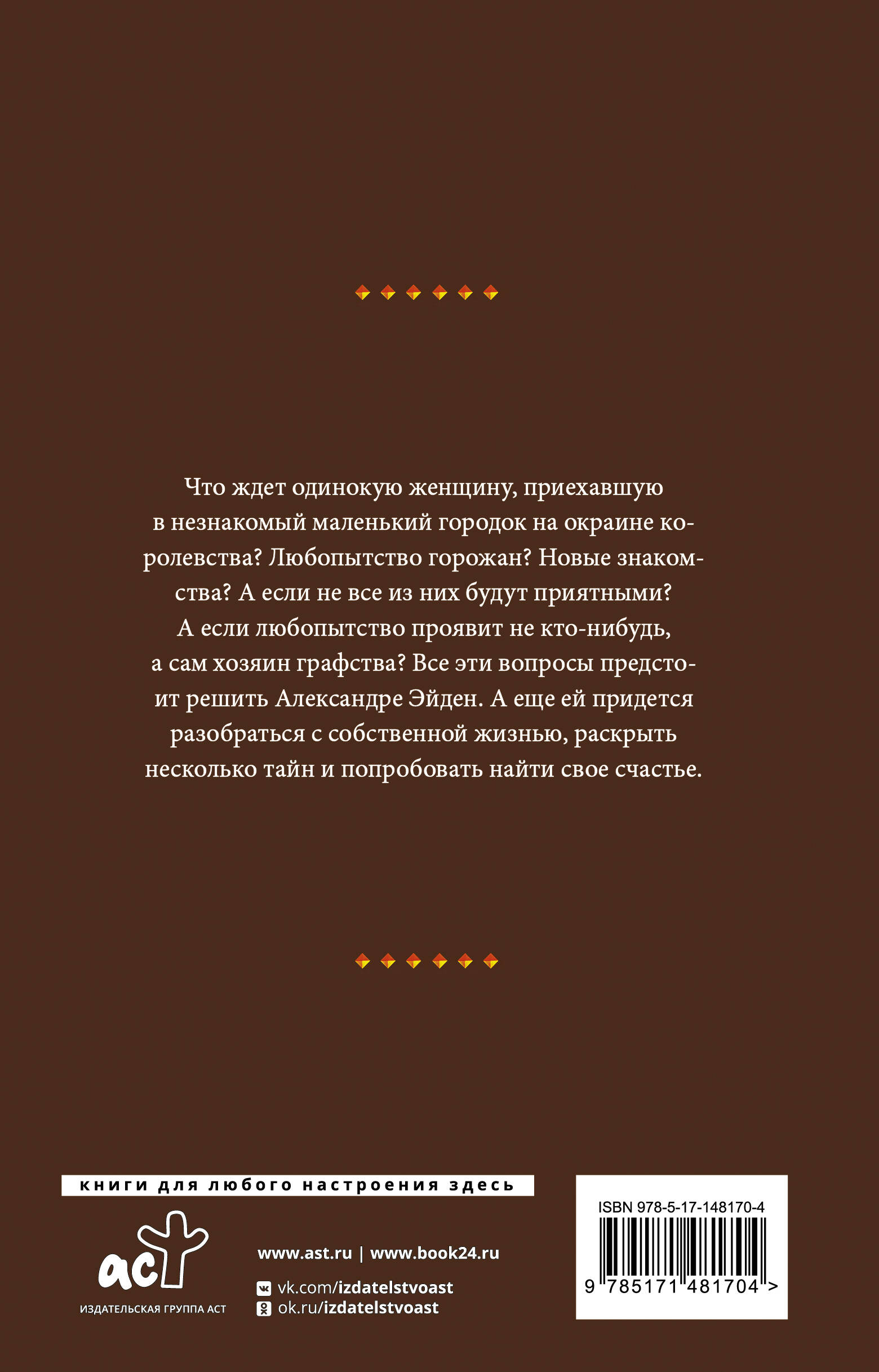 Что ждет одинокую женщину, приехавшую в незнакомый маленький городок на окраине королевства? Любопытство горожан? Новые знакомства? А если не все из них будут приятными? А если любопытство проявит не кто-нибудь, а сам хозяин графства? Все эти вопросы предстоит решить Александре Эйден. А еще ей придется разобраться с собственной жизнью, раскрыть несколько тайн и попробовать найти свое счастье.