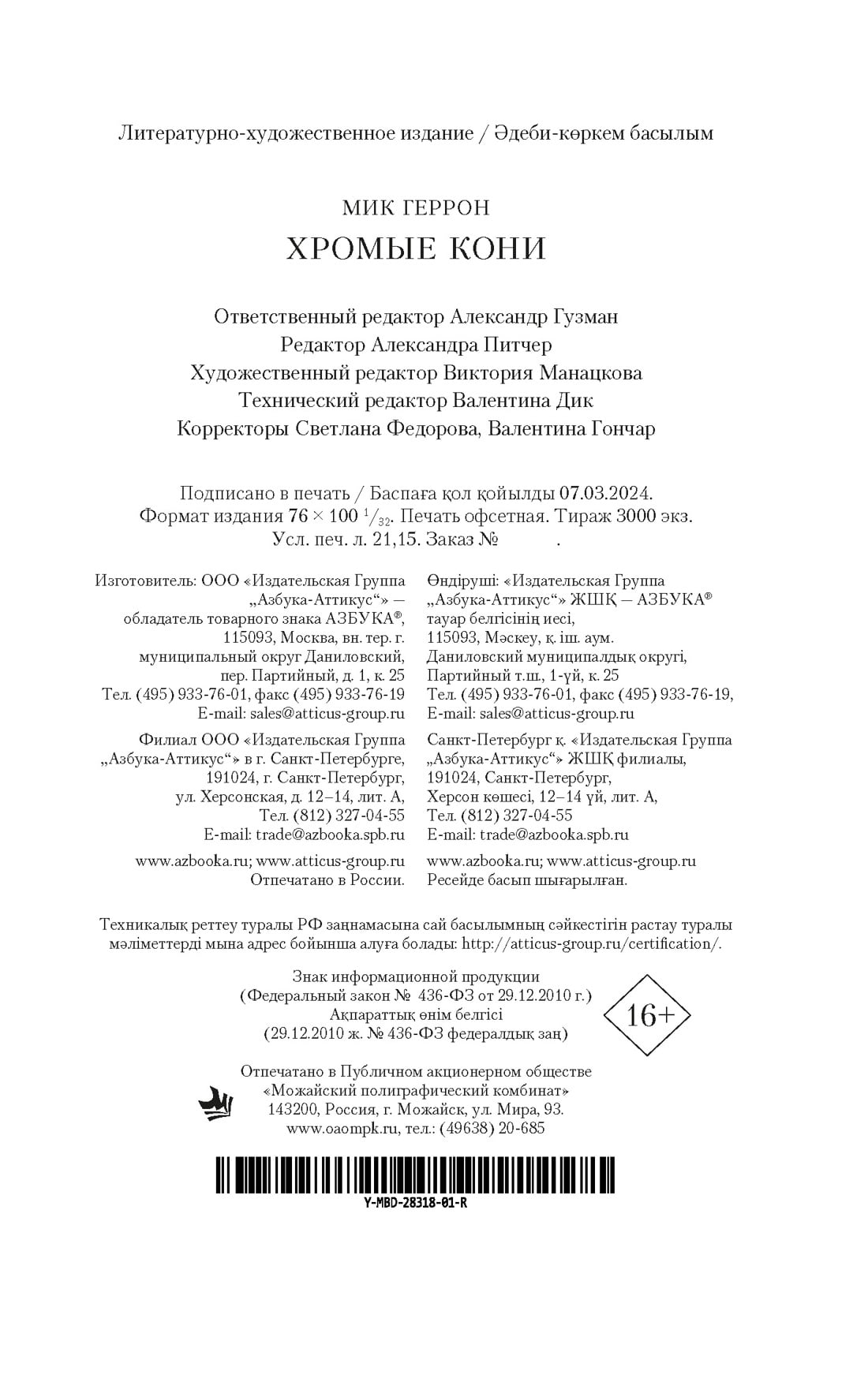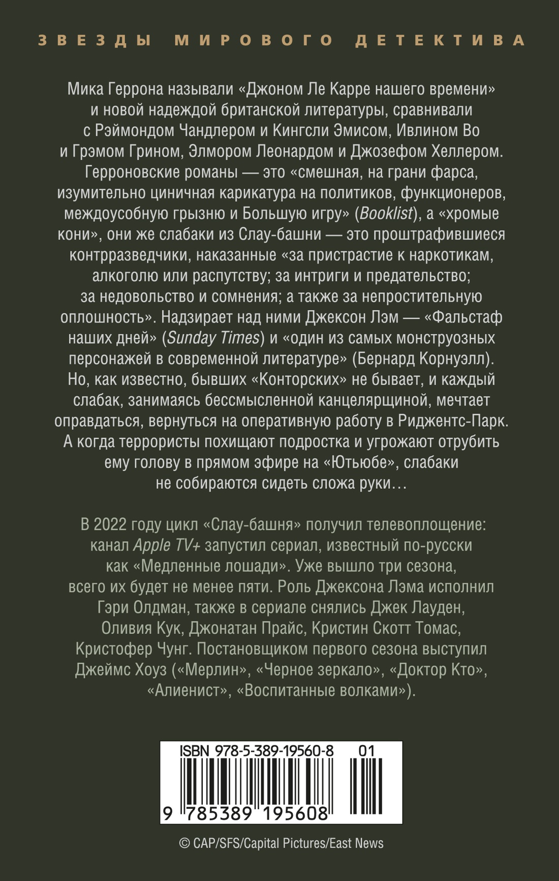 Мика Геррона называли «Джоном Ле Карре нашего времени» и новой надеждой британской литературы, сравнивали с Рэймондом Чандлером и Кингсли Эмисом, Ивлином Во и Грэмом Грином, Элмором Леонардом и Джозефом Хеллером. Герроновские романы - это «смешная, на грани фарса, изумительно циничная карикатура на политиков, функционеров, междоусобную грызню и Большую игру» (Booklist), а «хромые кони», они же слабаки из Слау-башни - это проштрафившиеся контрразведчики, наказанные «за пристрастие к наркотикам, алкоголю или распутству; за интриги и предательство; за недовольство и сомнения; а также за непростительную оплошность». Надзирает над ними Джексон Лэм - «Фальстаф наших дней» (Sunday Times) и «один из самых монструозных персонажей в современной литературе» (Бернард Корнуэлл). Но, как известно, бывших «Конторских» не бывает, и каждый слабак, занимаясь бессмысленной канцелярщиной, мечтает оправдаться, вернуться на оперативную работу в Риджентс-Парк. А когда террористы похищают подростка и угрожают отрубить ему голову в прямом эфире на «Ютьюбе», слабаки не собираются сидеть сложа руки... В 2022 году цикл «Слау-башня» получил телевоплощение: канал Apple TV+ запустил сериал, известный по-русски как «Медленные лошади». Уже вышло три сезона, всего их будет не менее пяти. Роль Джексона Лэма исполнил Гэри Олдман, также в сериале снялись Джек Лауден, Оливия Кук, Джонатан Прайс, Кристин Скотт Томас, Кристофер Чунг. Постановщиком первого сезона выступил Джеймс Хоуз («Мерлин», «Черное зеркало», «Доктор Кто», «Алиенист», «Воспитанные волками»).| Издательство | Азбука |