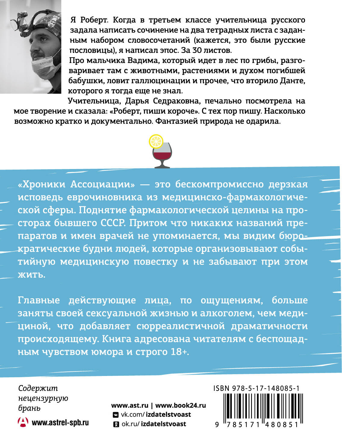 Для всех фанатов Цыпкина и Бессонова. Сборник ярких и дерзких рассказов. Беспощадный юмор, лёгкий живой слог и искренность в каждой строчке. «Хроники Ассоциации» - это бескомпромиссно дерзкая исповедь еврочиновника из медицинско-фармакологической сферы. Поднятие фармакологической целины на просторах бывшего СССР. Хотя никаких названий препаратов и имен врачей не упоминается, мы видим бюрократические будни людей, которые организовывают событийную медицинскую повестку и не забывают при этом жить. Главные действующие лица, по ощущениям, больше заняты своей сексуальной жизнью и алкоголем, чем медициной, что добавляет сюрреалистичной драматичности происходящему. Книга адресована читателям с беспощадным чувством юмора и строго 18+.| Издательство | АСТ |
