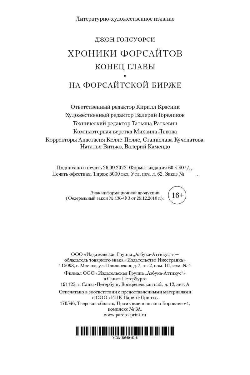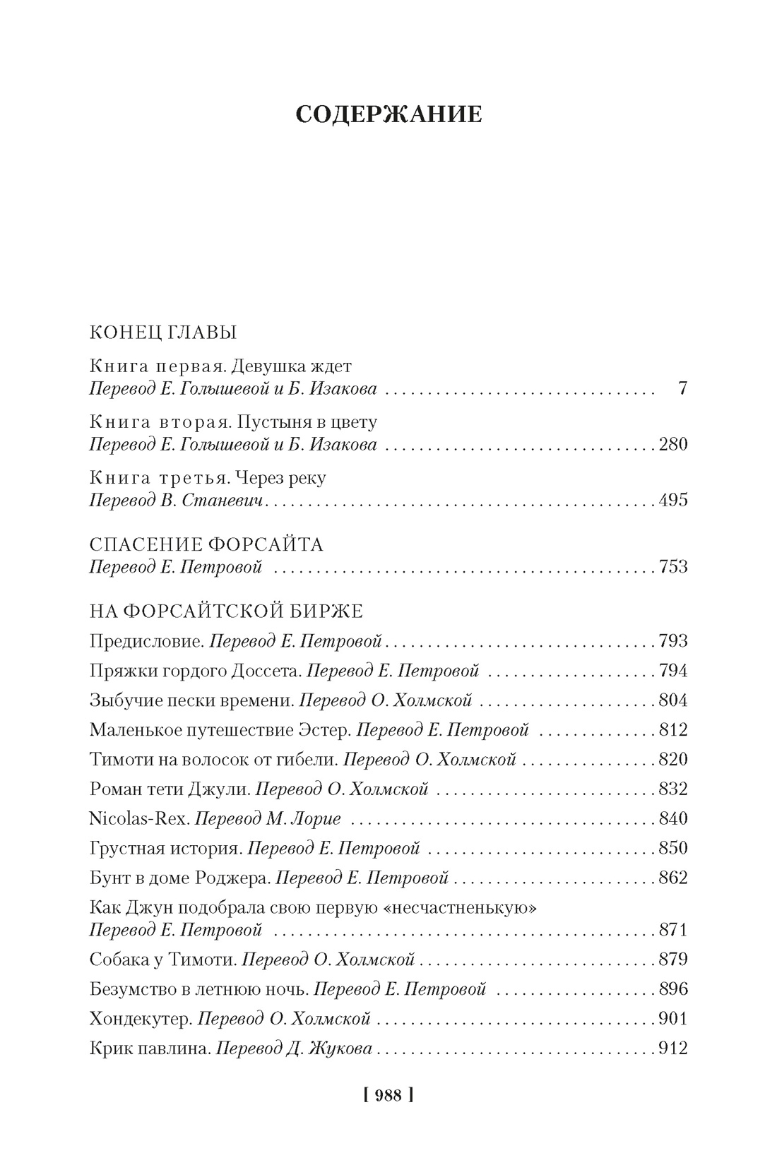 В 1932 году английский писатель Джон Голсуорси был удостоен Нобелевской премии «за высокое искусство повествования, вершиной которого является "Сага о Форсайтах"». Этот знаменитый цикл входит в обширные «Хроники Форсайтов», воссоздающие несколько десятилетий истории одной семьи и открывающие мир, скрытый за красивой ширмой успеха: мир потаенных страстей, сломанных судеб, несостоявшегося счастья, безнадежной любви и трагического одиночества. В настоящем издании представлена трилогия «Конец главы», последняя часть «Хроник», три романа о дальних родственниках Форсайтов, обедневших наследниках некогда влиятельного дворянского рода Черрел, приверженцах традиционного жизненного уклада старой Англии. Также в книгу вошли произведения из «Хроник Форсайтов», созданные в малой форме: впервые на русском в полном виде авторский сборник рассказов «На Форсайтской Бирже», в котором собраны истории из жизни Форсайтов разных поколений, и повесть «Спасение Форсайта», представленная в новом переводе, первое произведение из «Хроник», давшее рождение знаменитой саге.| Издательство | Иностранка |